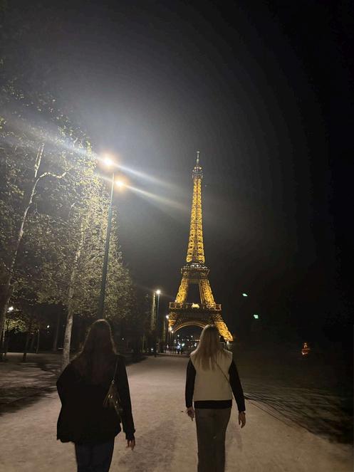Marie Trennert, now in France, visited Paris and the Eiffel Tower, pictured lit up at night.