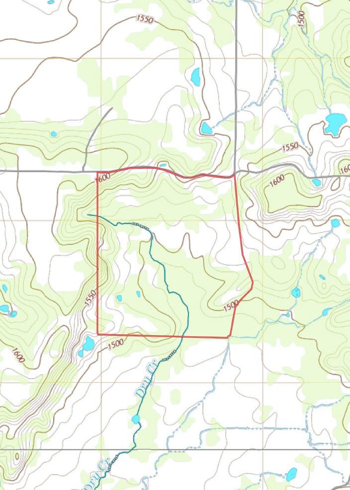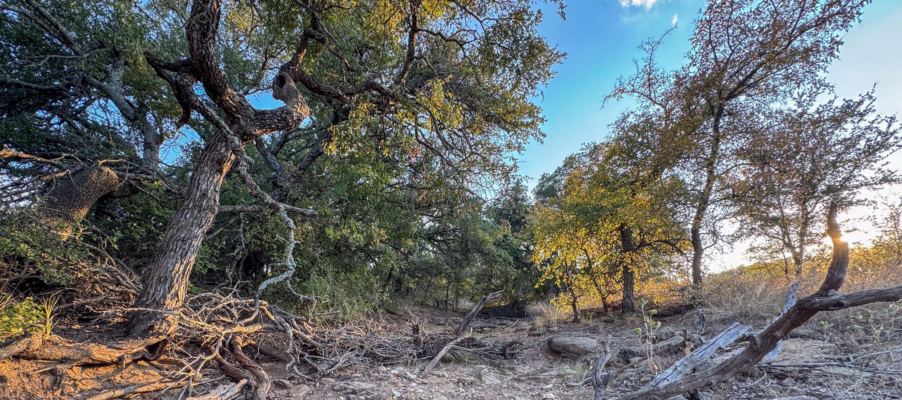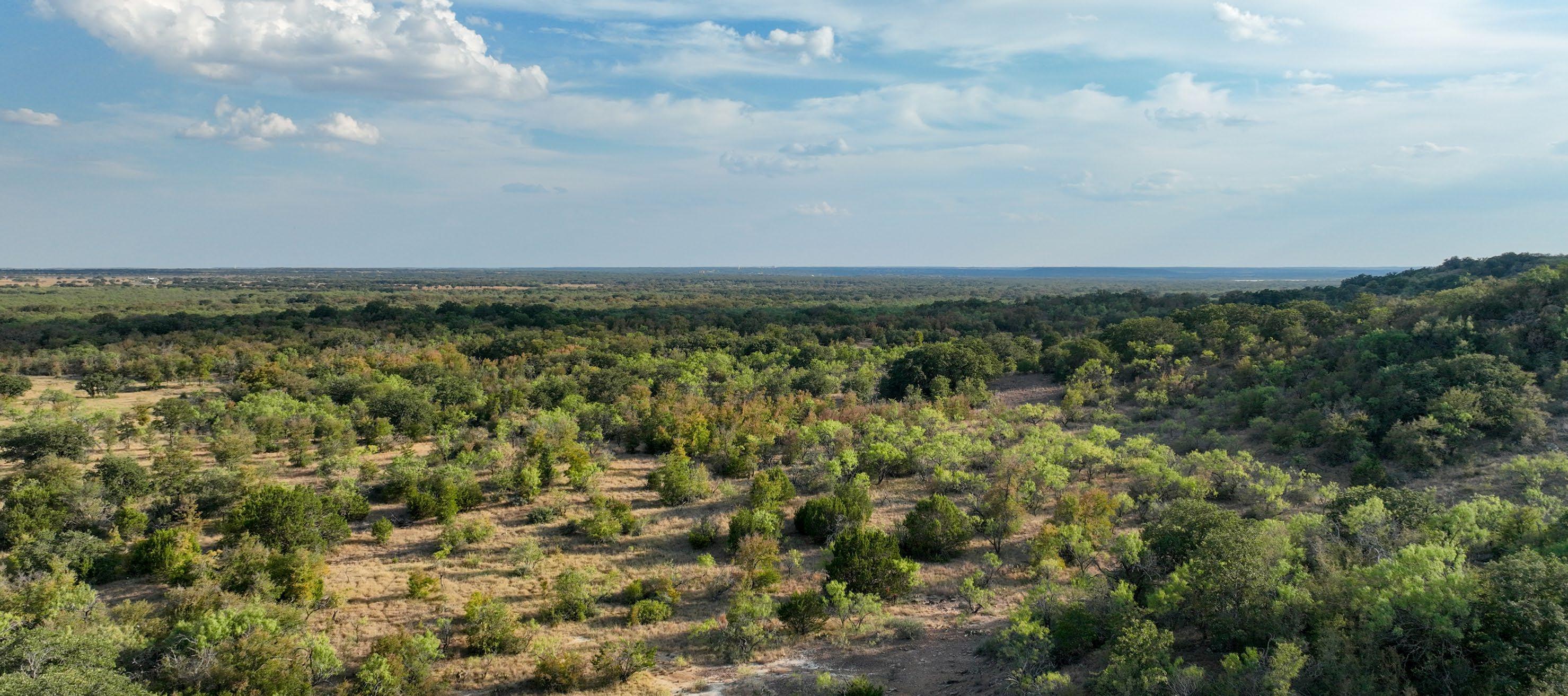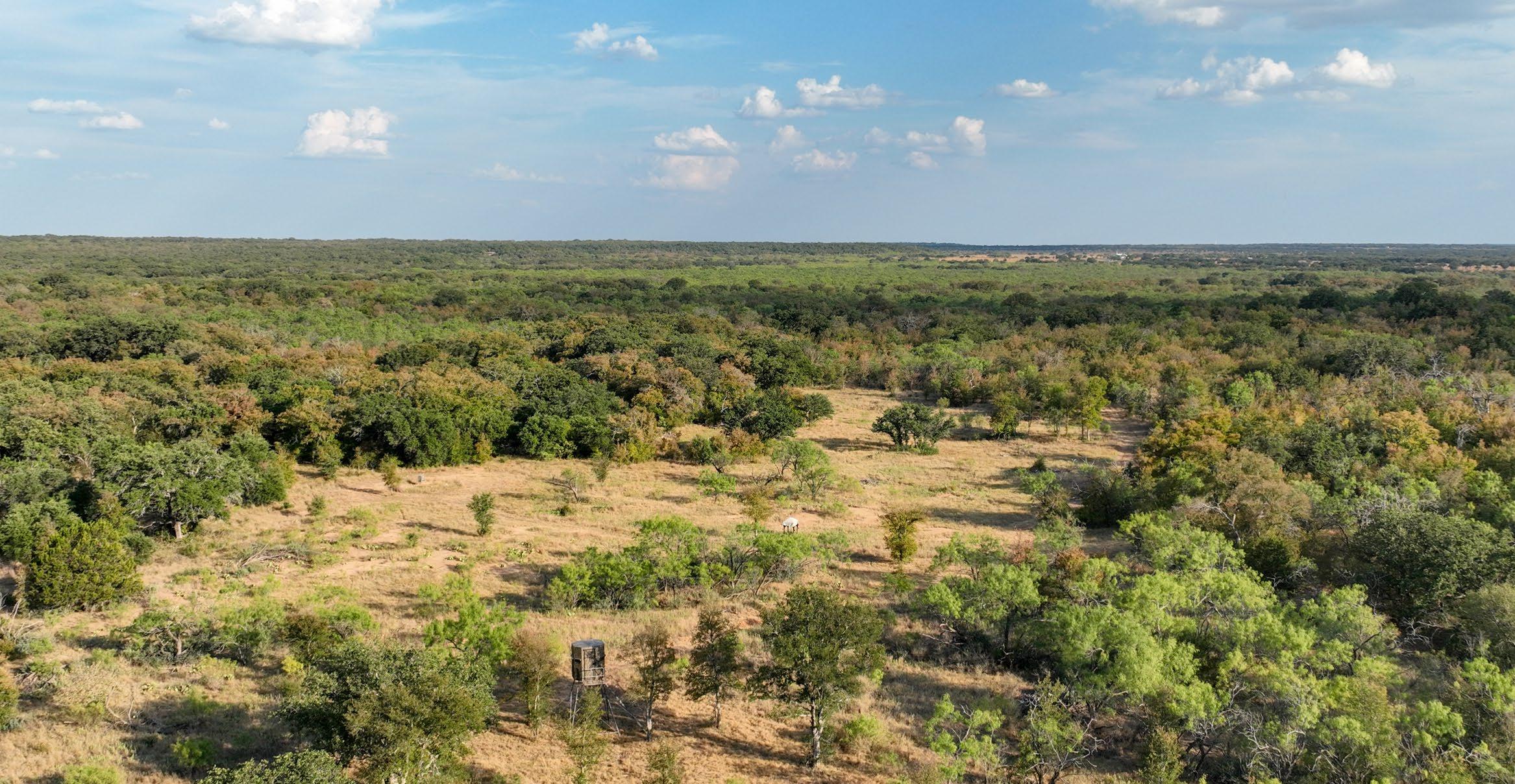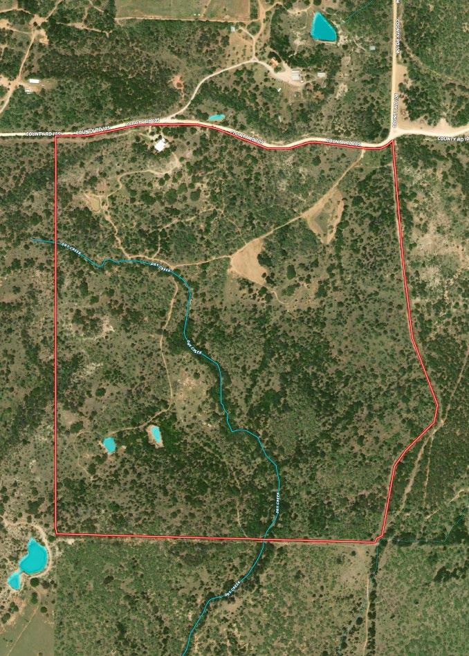 The topography of the ranch varies from fairly level on the very north end of the ranch to more broken country as you move south. An elevated ridge meanders along the west and north sides of the ranch, causing the property to drain to the east and south. Dry Creek which is a small wet weather creek enters the property on the northwest side and meanders all the way through the center of the ranch exiting the property on the south end. There is over 120 feet of elevation change on the ranch, ranging from 1,600 feet on the northwest side, to 1,480 feet on the south-central end of the property. There is an excellent turf of grass across the ranch with grass species that include Little Bluestem, Big Bluestem, Sideoats Grama, Arizona Cotton Top, Silver Bluestem, Texas Winter Grass, Buffalograss, and perennial forbes to name a few. There is a moderate to heavy canopy of brush across the ranch that include multiple species of oak trees, Mesquite Trees, and junipers.