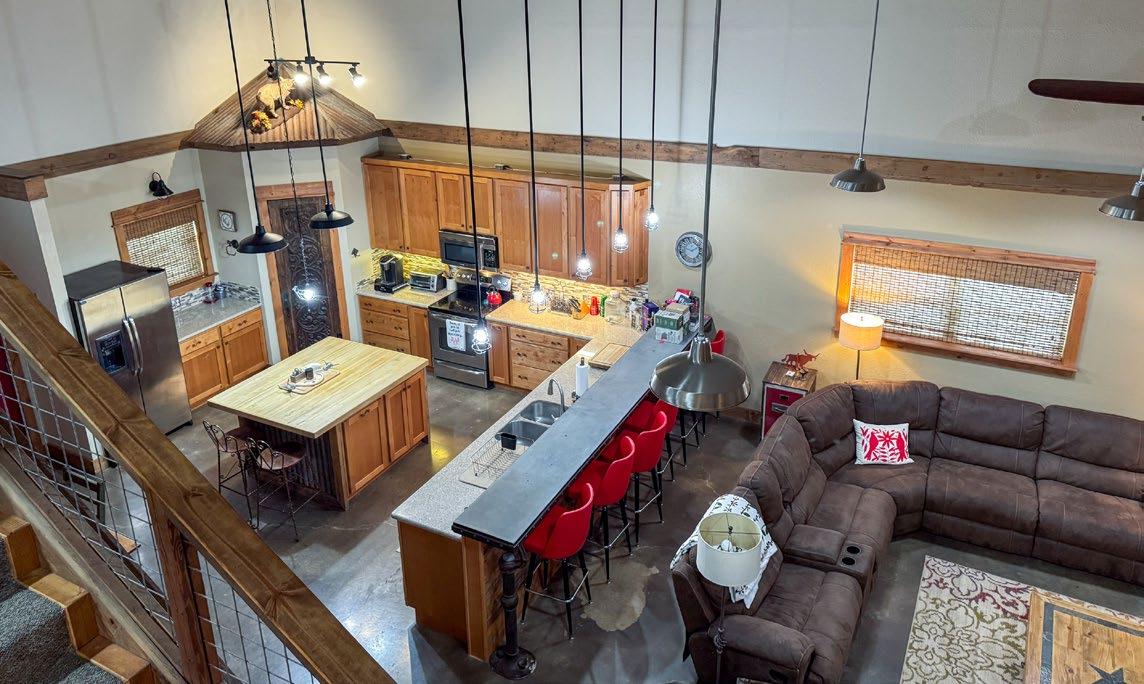 The living area consists of approximately 2,500 sq. ft., with four bedrooms, three bathrooms, one half bathroom, and a loft area on the second floor. There is a large open concept kitchen/living room/dining room. The kitchen features all stainless-steel appliances, hard surface counter tops, butter block island, and bar area, and large pantry. The living area has central heat and air. There is a garage located on the northeast side of the house that includes approximately 1,250 sq. ft. with two large rollup doors, and safe room.