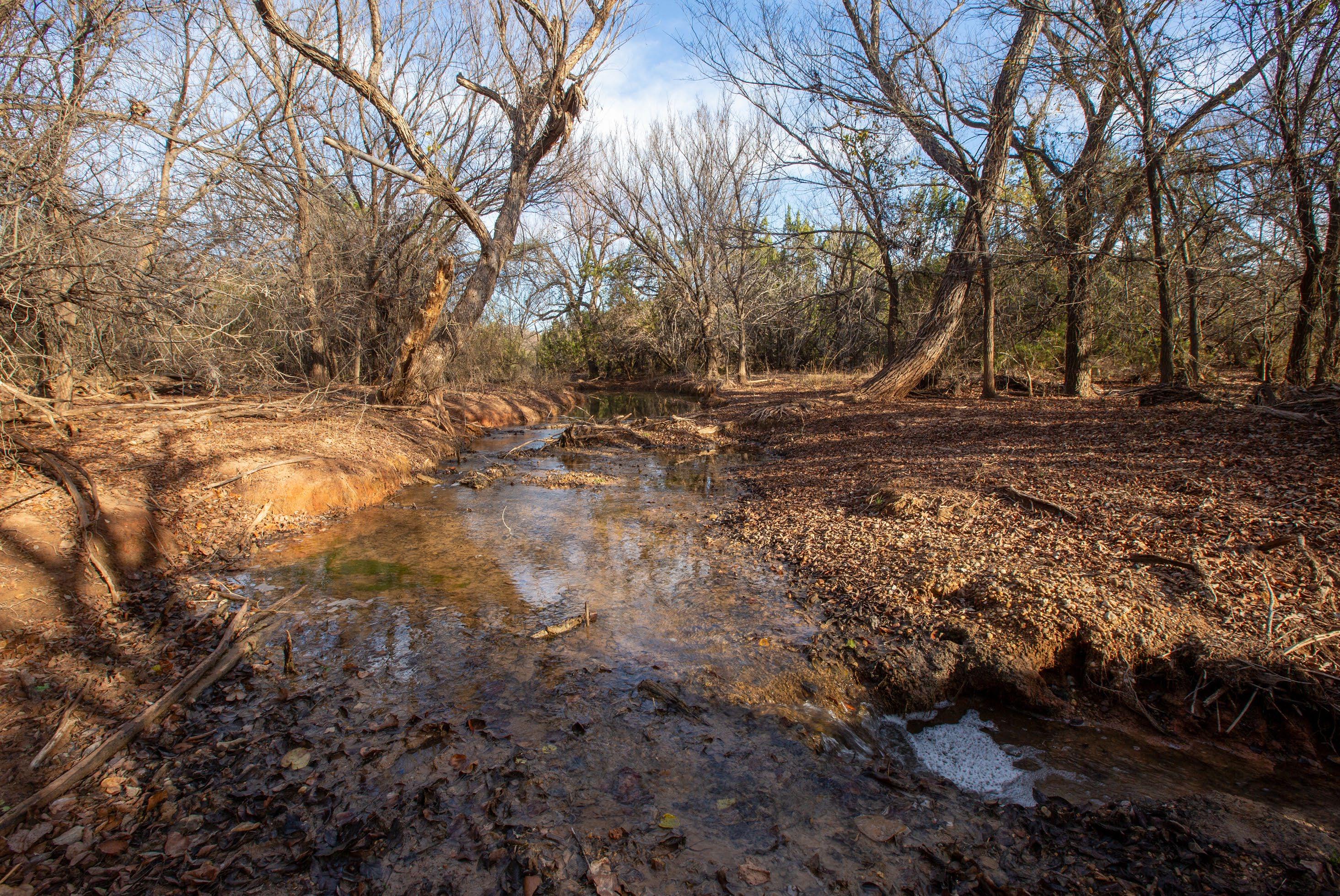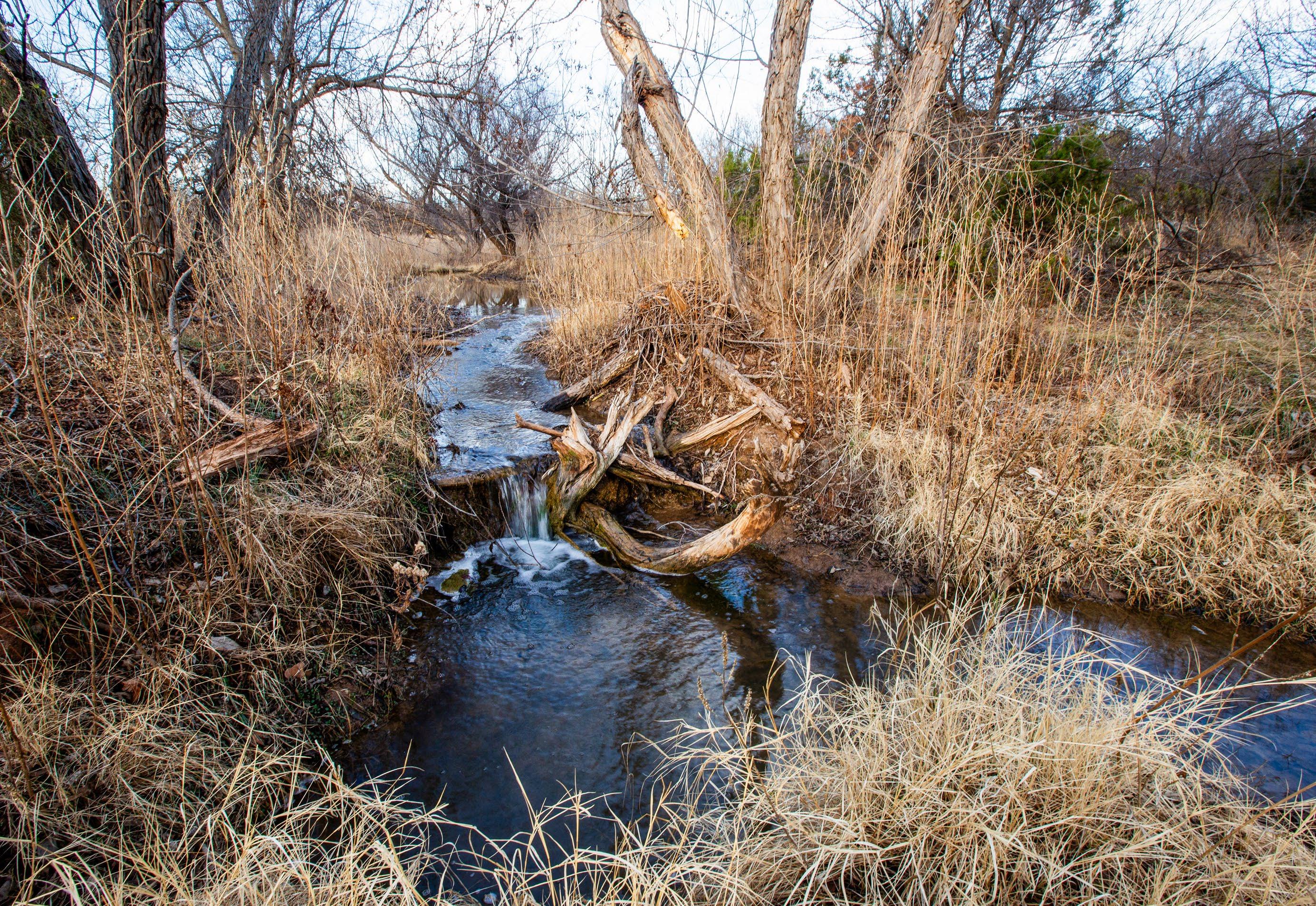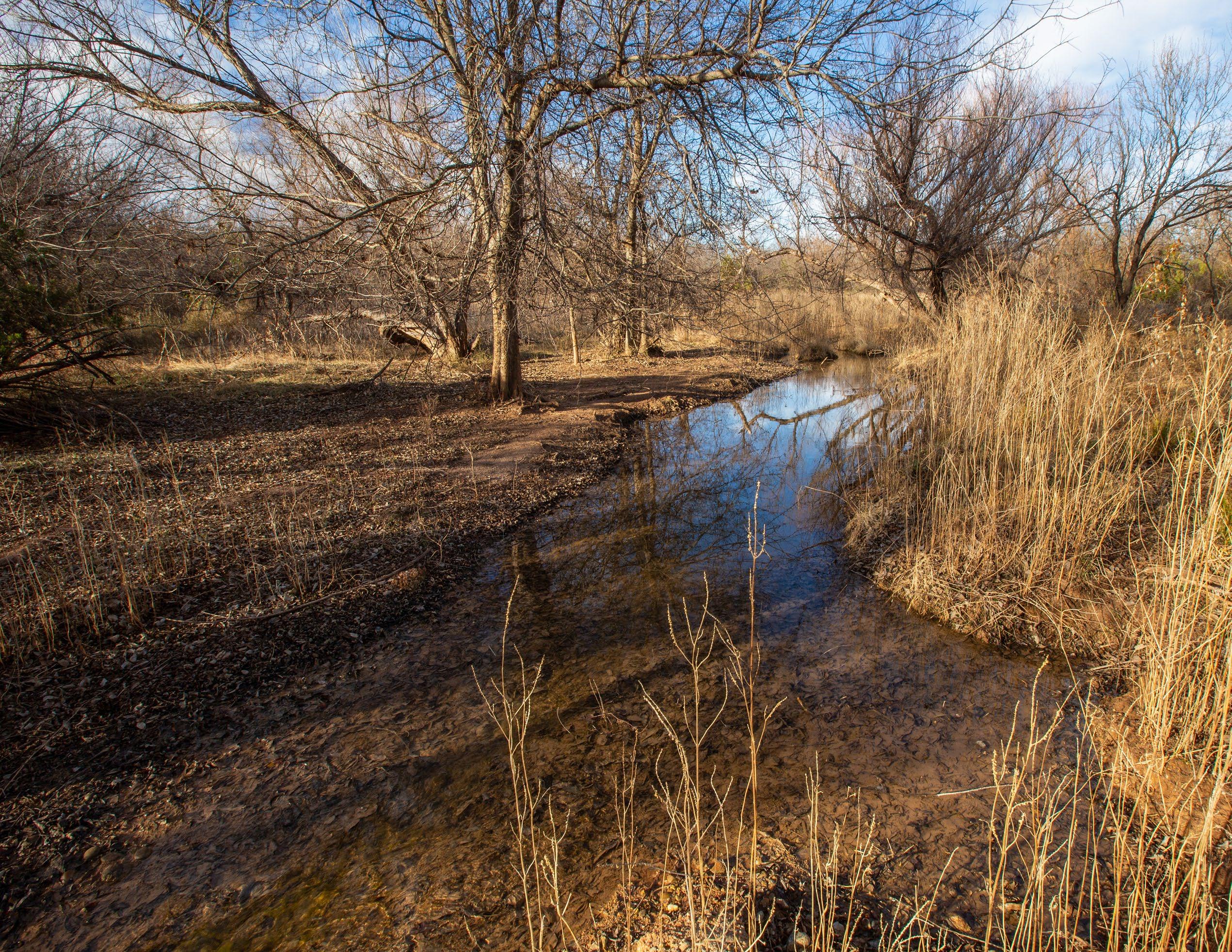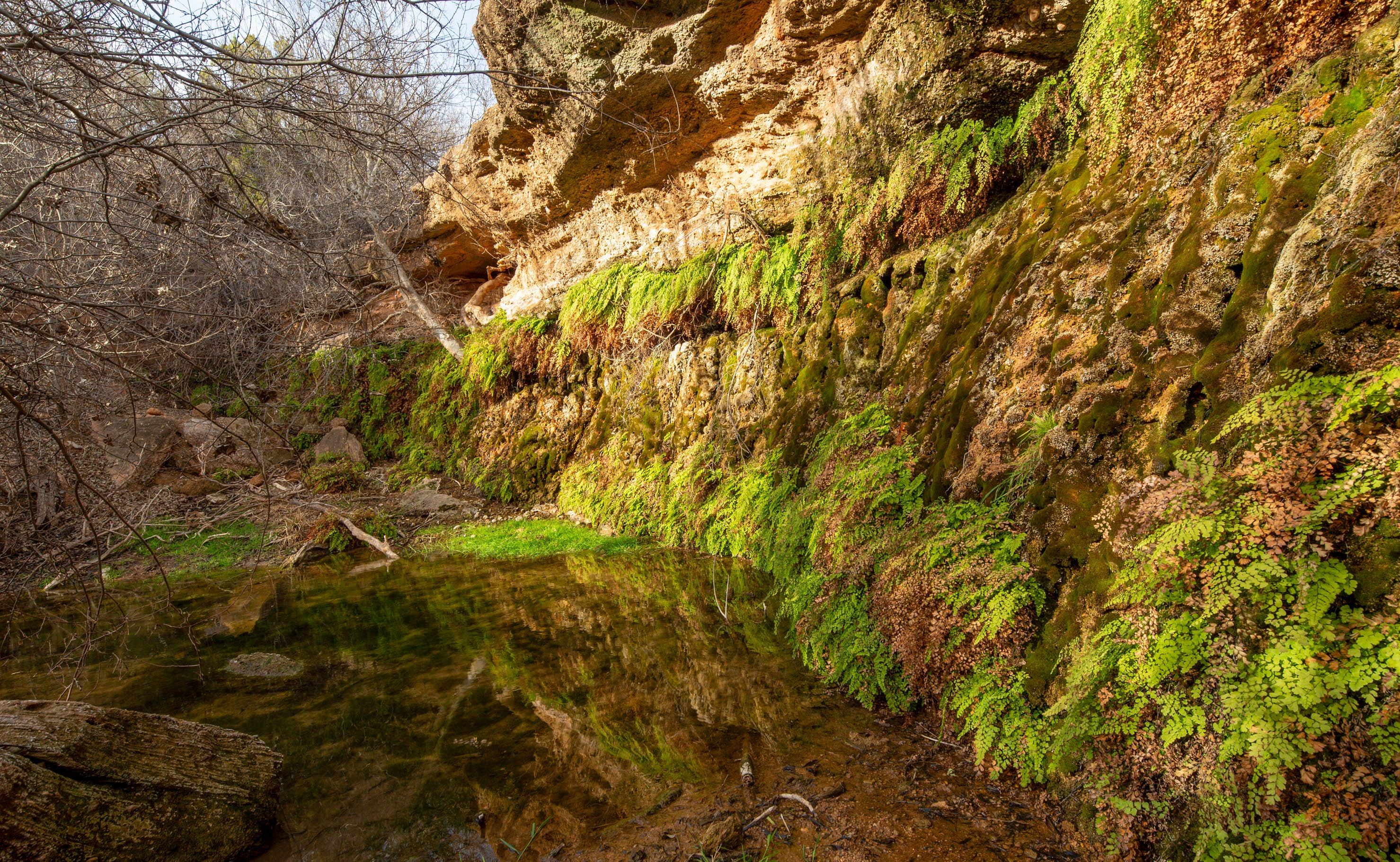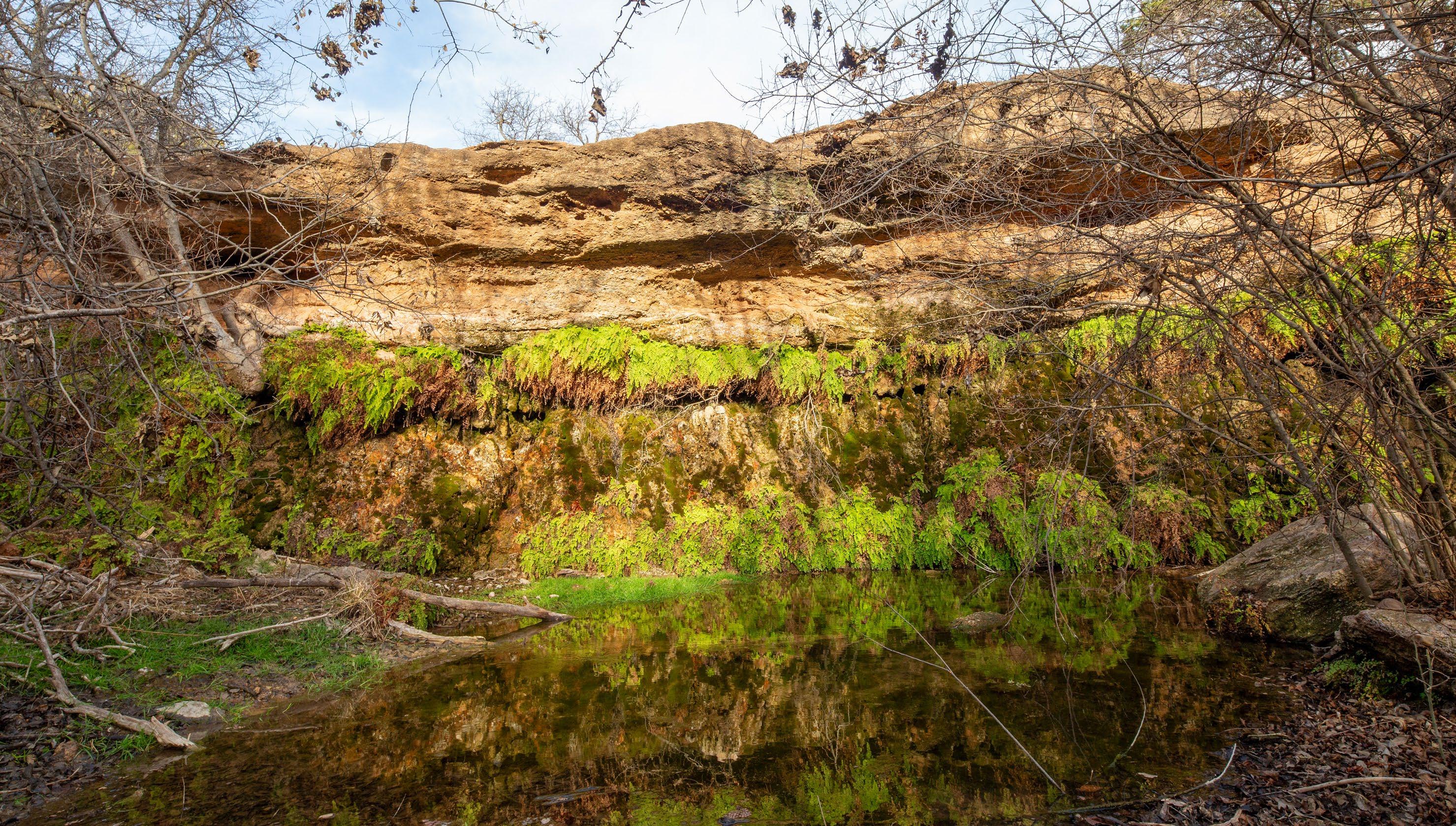 These springs provided dependable water during historic droughts, including 1902 and 1918, when cattle were driven long distances to reach reliable flow, and again during the 2011 drought, demonstrating exceptional long-term resilience. Numerous secondary seeps discharge along the creek corridor, creating shaded pools, wet banks, and continuous surface water that persists year-round.