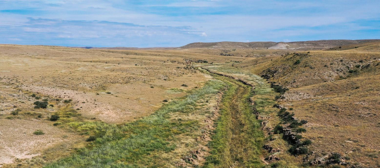 The terrain of the Cowboy Mill Ranch is diverse. The northern 2/3 of the ranch is primarily rolling plains country. The southern 1/3 of the ranch becomes hillier and more broken, offering good winter protection for livestock. Elevations range from 5,351 feet MSL on Galla Mesa in the southern part of the ranch, descending to 4,800 feet MSL in the Corn Draw and Gallo Arroyo bottoms. These are the two most prominent drainages meandering through the northern and southern portions of the ranch, respectively. Other drainages include Cowboy Draw and Wildcat Canyon.