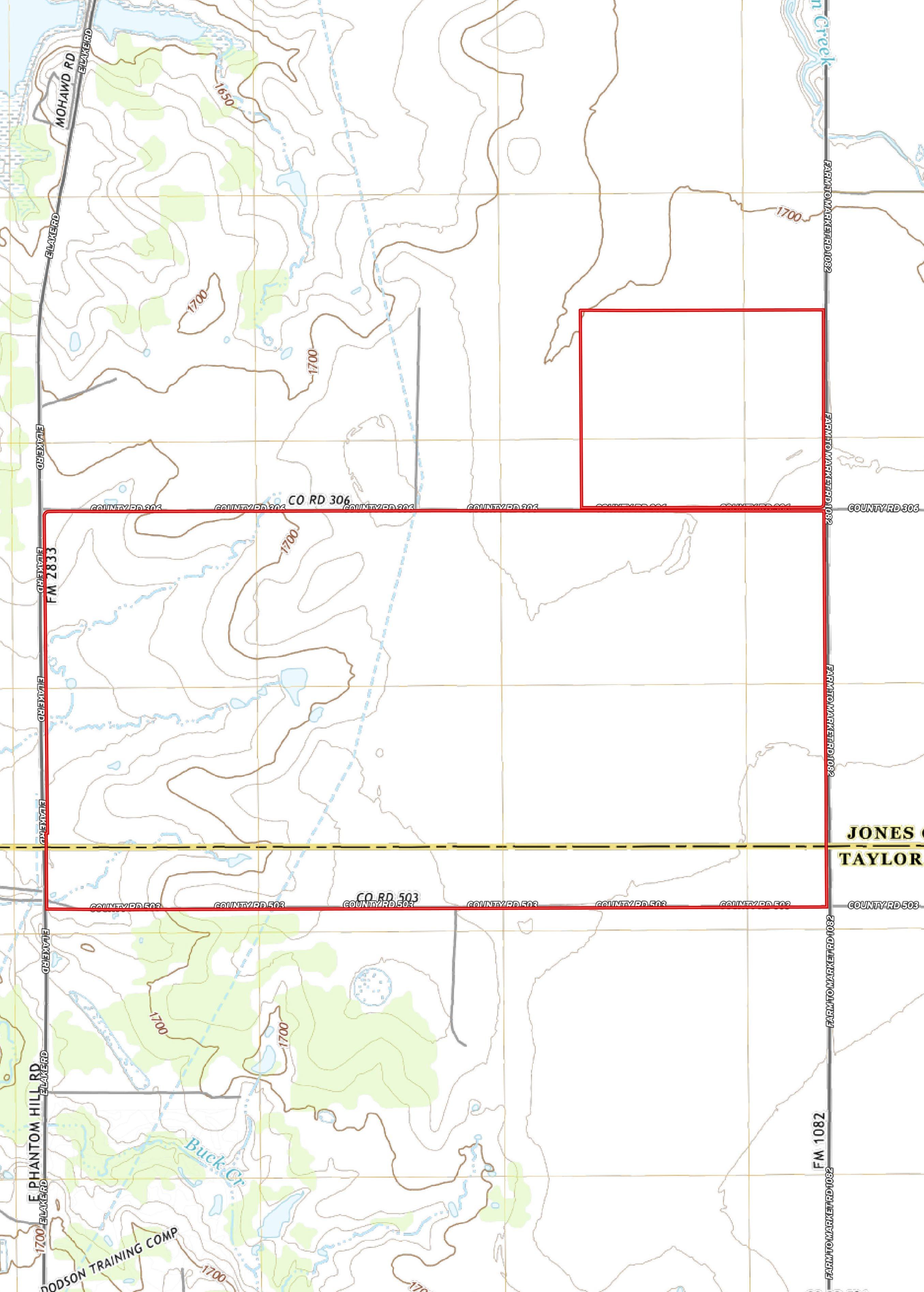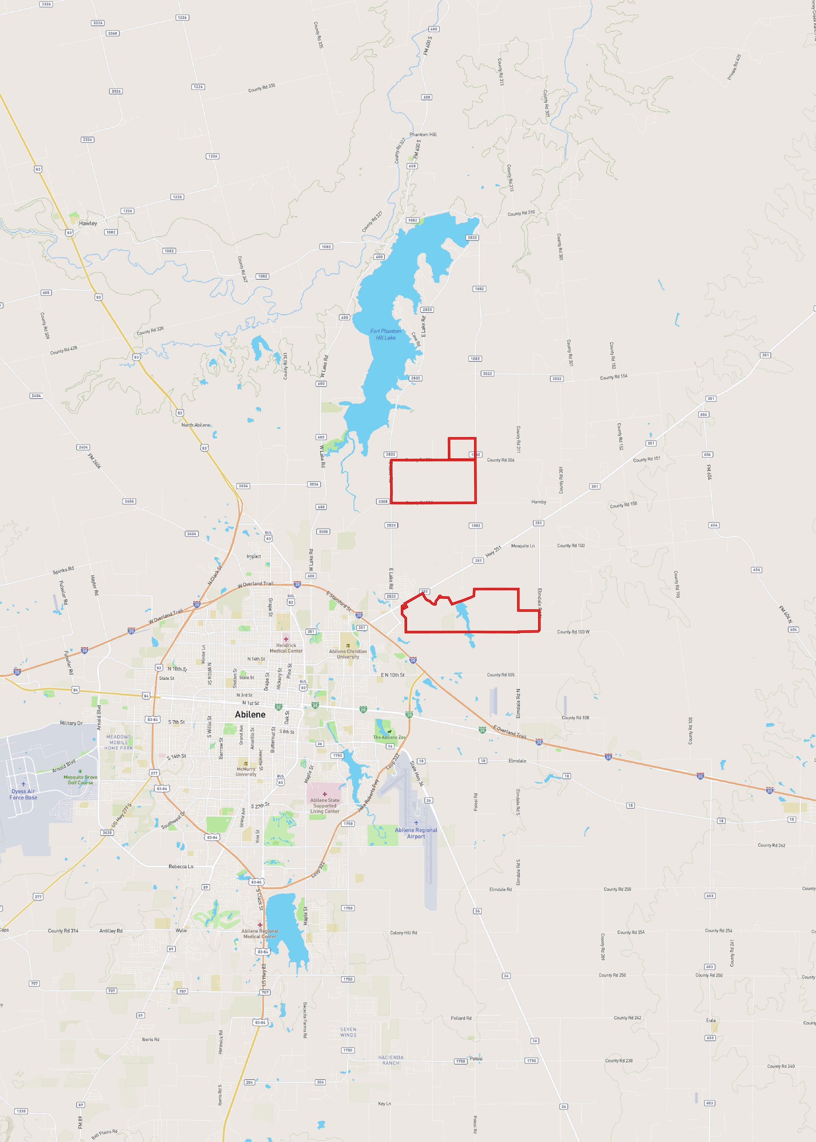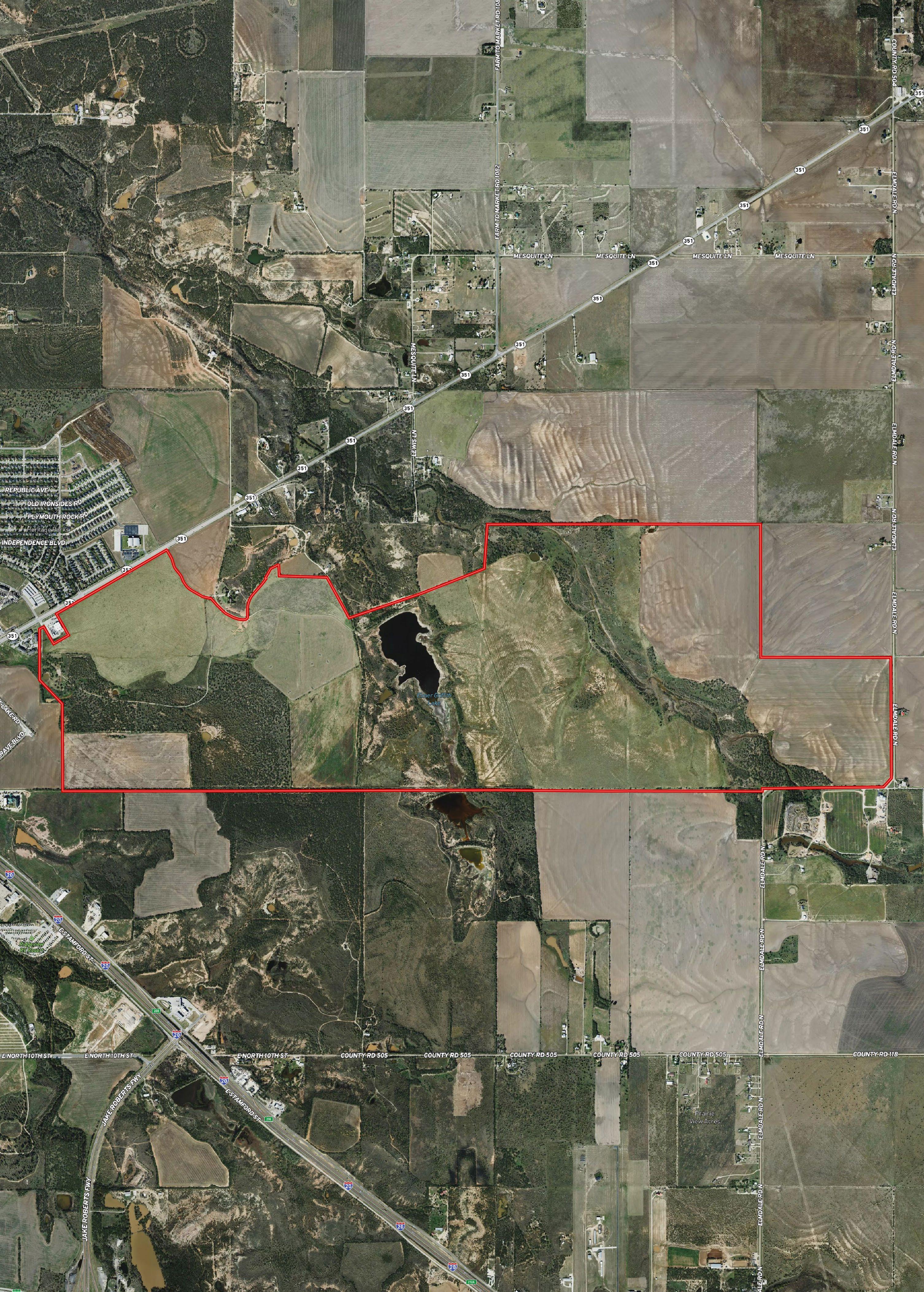 The western portion of this property is located in close proximity to both new commercial development and housing development. The northwest side of the property fronts State Highway 351, which is currently experiencing substantial growth and development. The property is approximately 1 mile wide from north to south and approximately 3 miles long from east to west. Through the middle of the property is a large, deep man made lake encompassing approximately 40 surface acres, at capacity. Paved Elmdale Road adjoins the southeastern and eastern property line. Approximately 900 acres are in dryland cultivation, with around 175 acres being under pivot sprinkler, and the remainder is in native pasture. Less than 15% of the property is in flood plain. Elevations range from approximately 1,700 feet to 1,775 feet above sea level. City water from Abilene is available on the property and waste effluent from Abilene provides irrigation for the pivots.