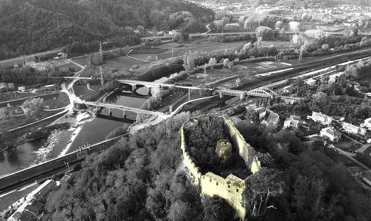 When walking along the Serchio river, the fost view of the hill is the ininal castle ruin.