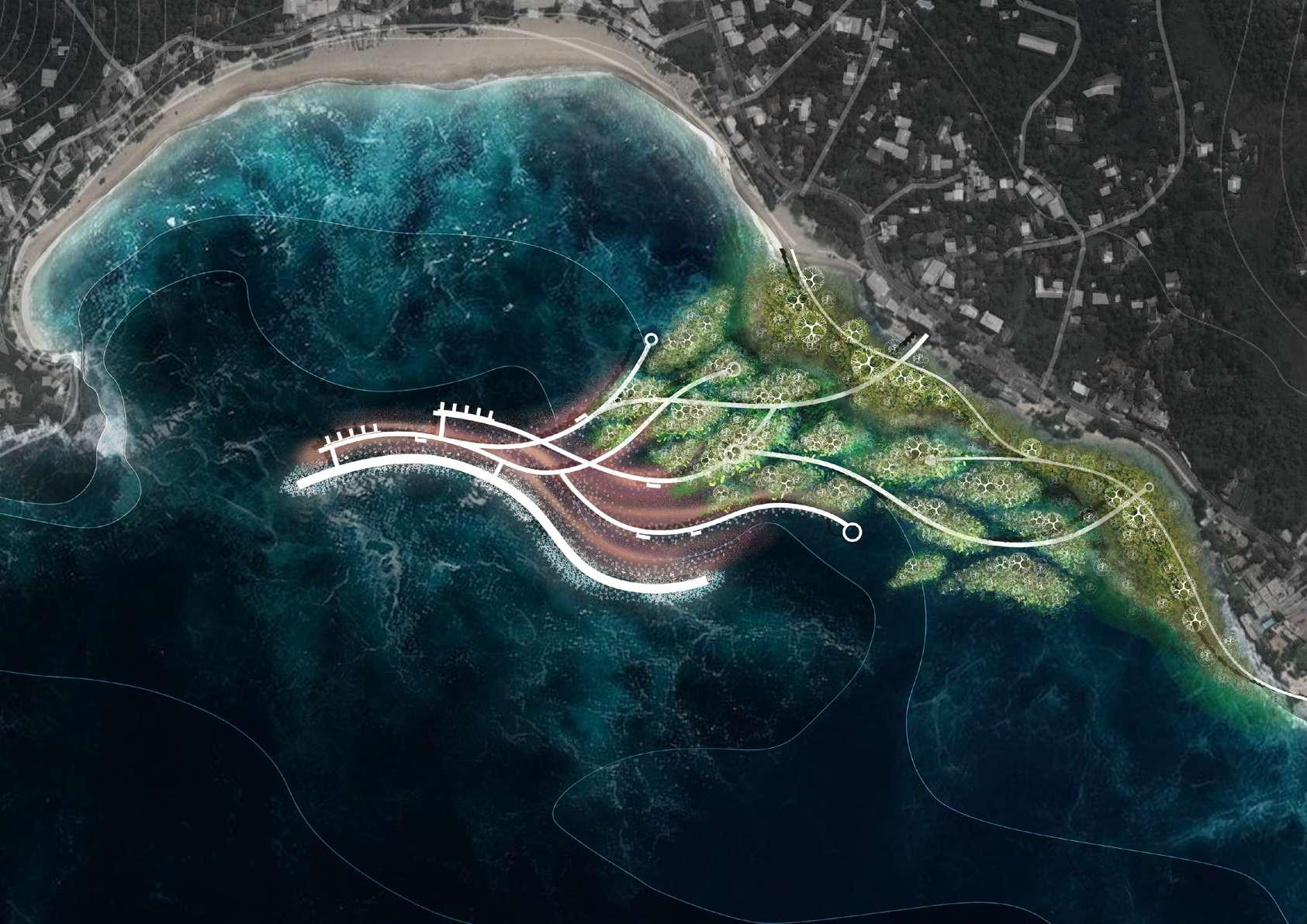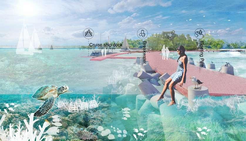 After the protection zone is divided, cruise ships will be moored at the pier through designated routes. The far sea is a breakwater piled up with prefabricated blocks, which is used as a tourist trail.Coral shelves are placed under the sea for tourists to dive and plant corals. A variety of marine life is restored here together.