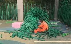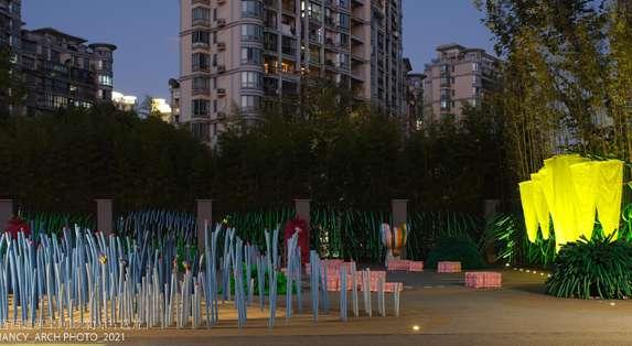 The design theme of Kid’s Garden in Bamboo Forest focuses on kids. FLO Landscape invited kid designers to participate deeply in the form of a “co-creation workshop”. The kid’s paintings in the first phase of the workshop are an important source of inspiration for garden design. While respecting the site’s dialogue with the surroundings, the design attempts to integrate fantasy elements such as the moon river, small bushes, and exotic flowers into the space, aiming to restore the play space imagined by the children. In response to construction period, season and budget constraints, designers introduced safe, cheap and recyclable foam stick materials.