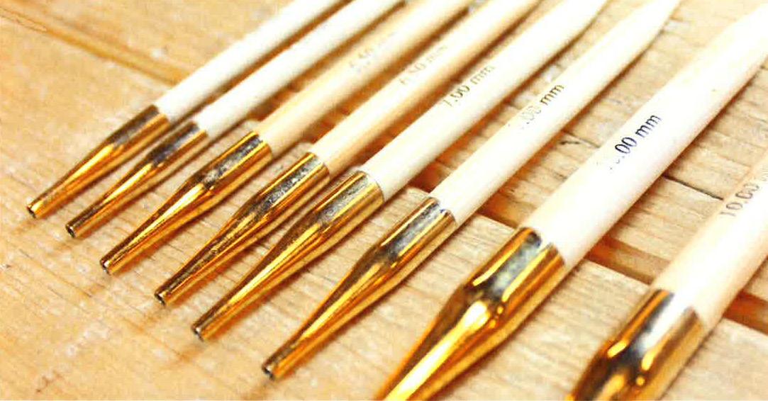 El kit contiene 1 mango de madera color beige, 4 agujas de acero inoxidable ajustables en 2 - 3 - 4 y 5 mm de diámetro, 3 anexos y 2 enhebradores
