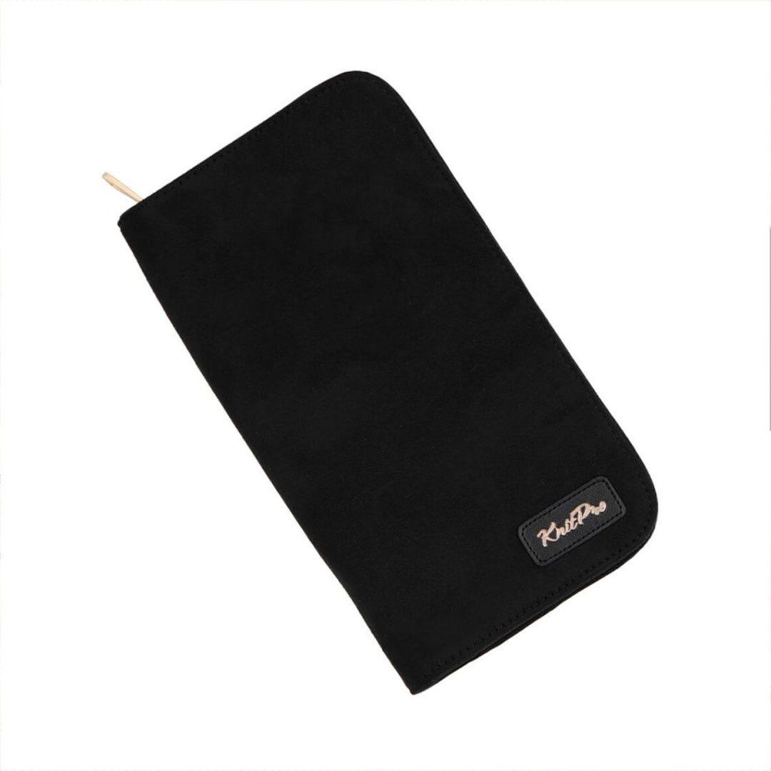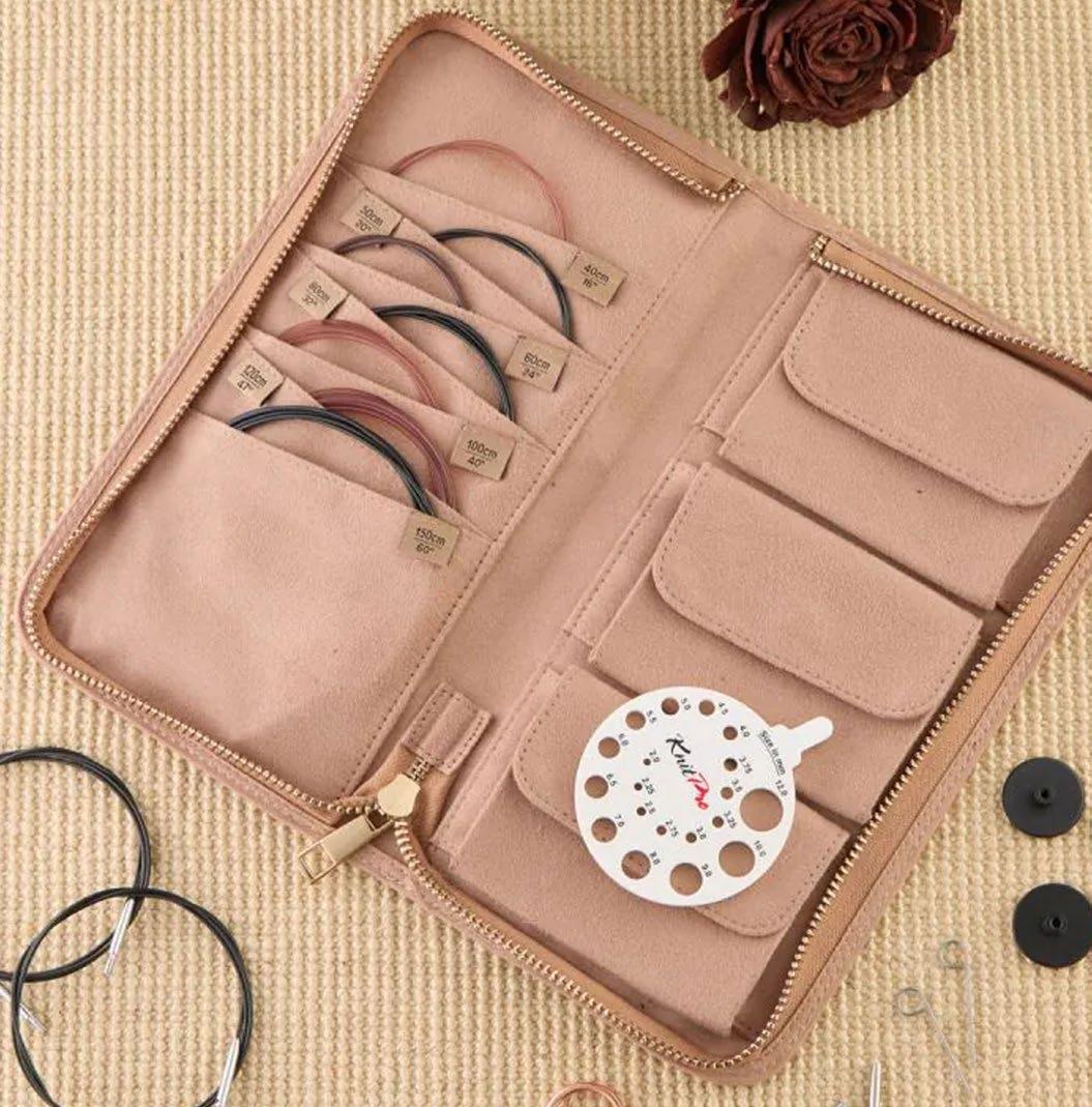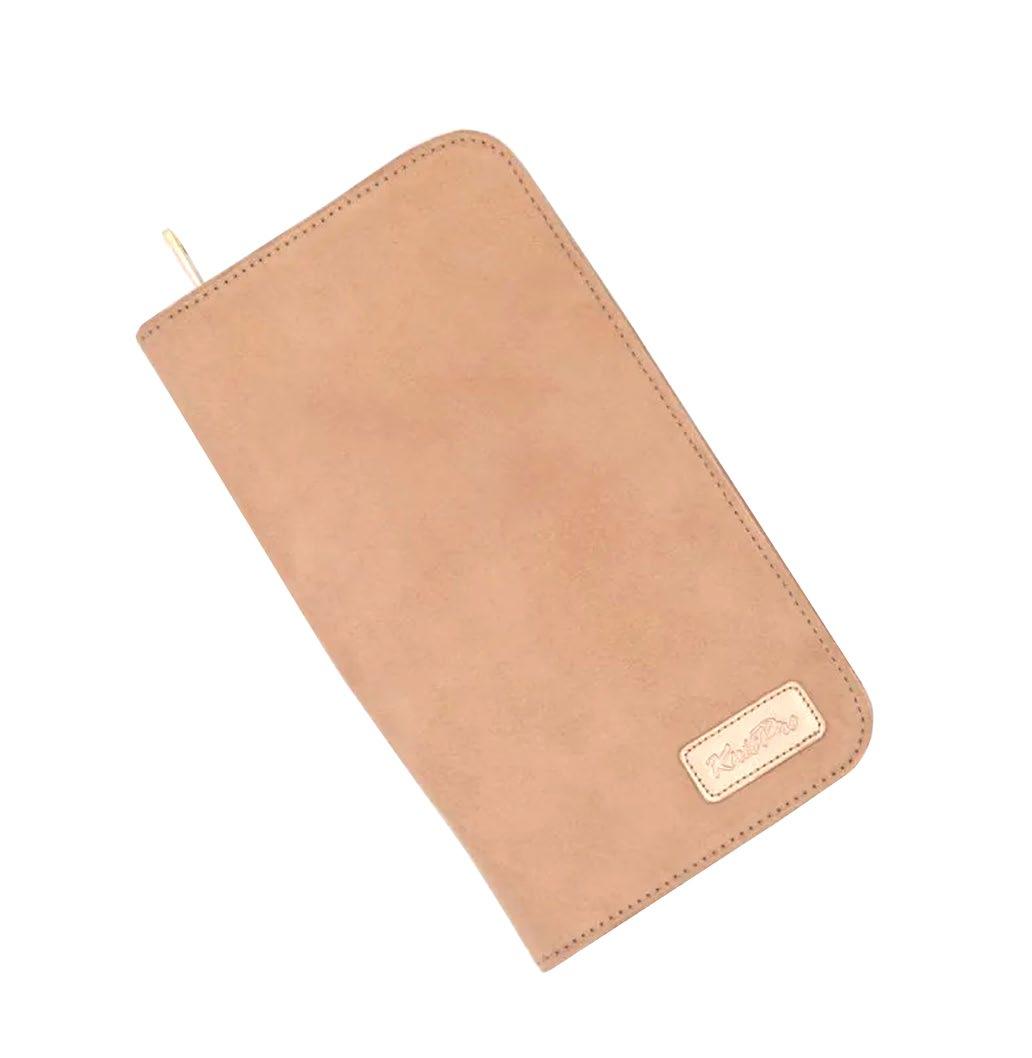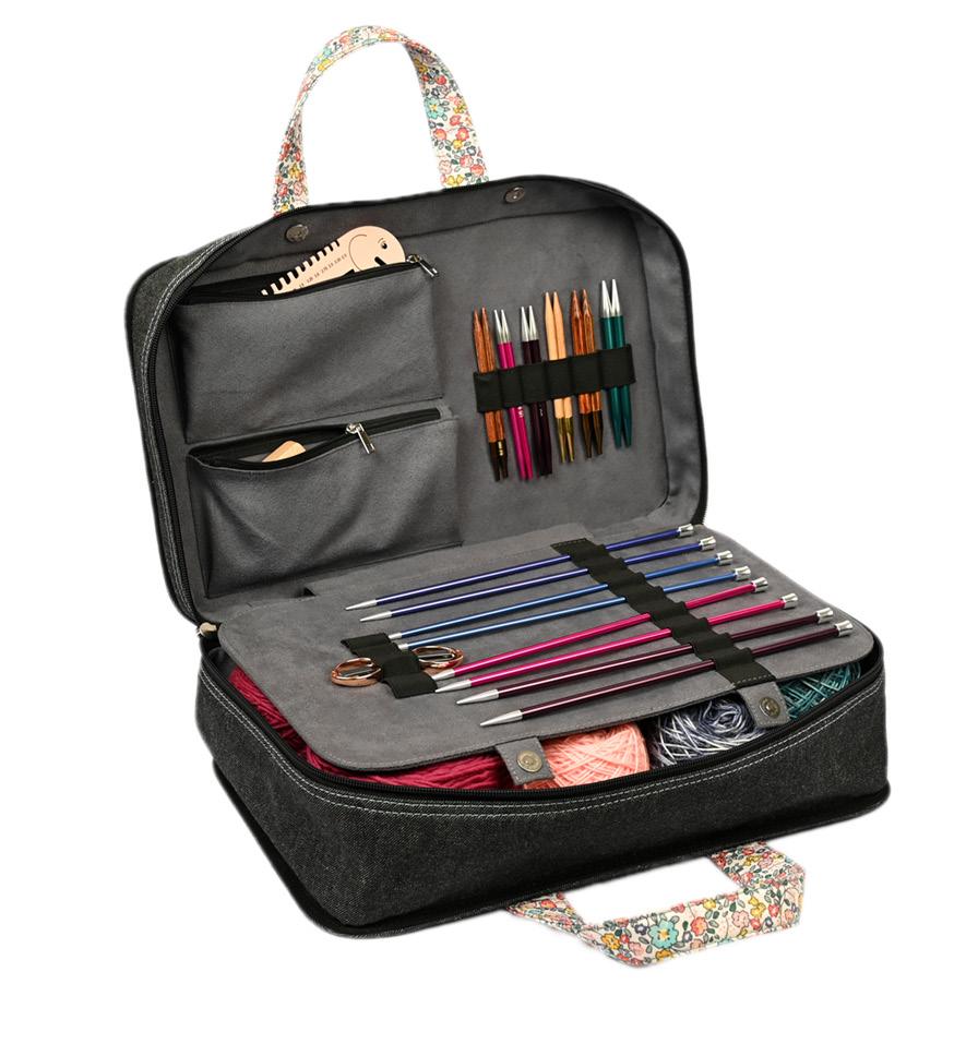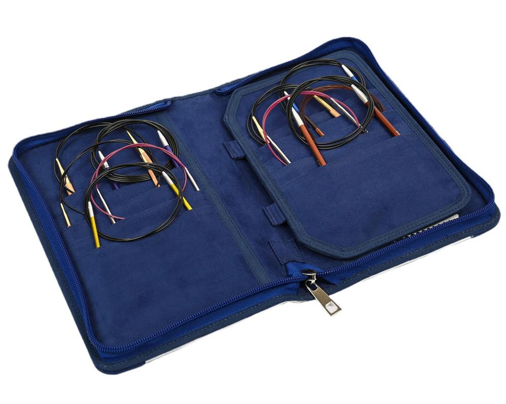 Etui pour aiguilles circulaires fixes d’une capacité de 22 paires. Avec doublure et poche intérieure zippée pour accessoires. (16x24.5cm)
