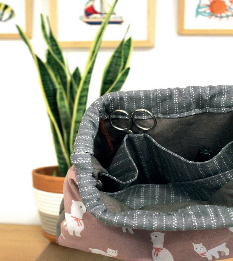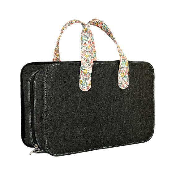 Con bolsillos interiores para accesorios, organizador de agujas y pasador para hilo. Cierre con cremallera.