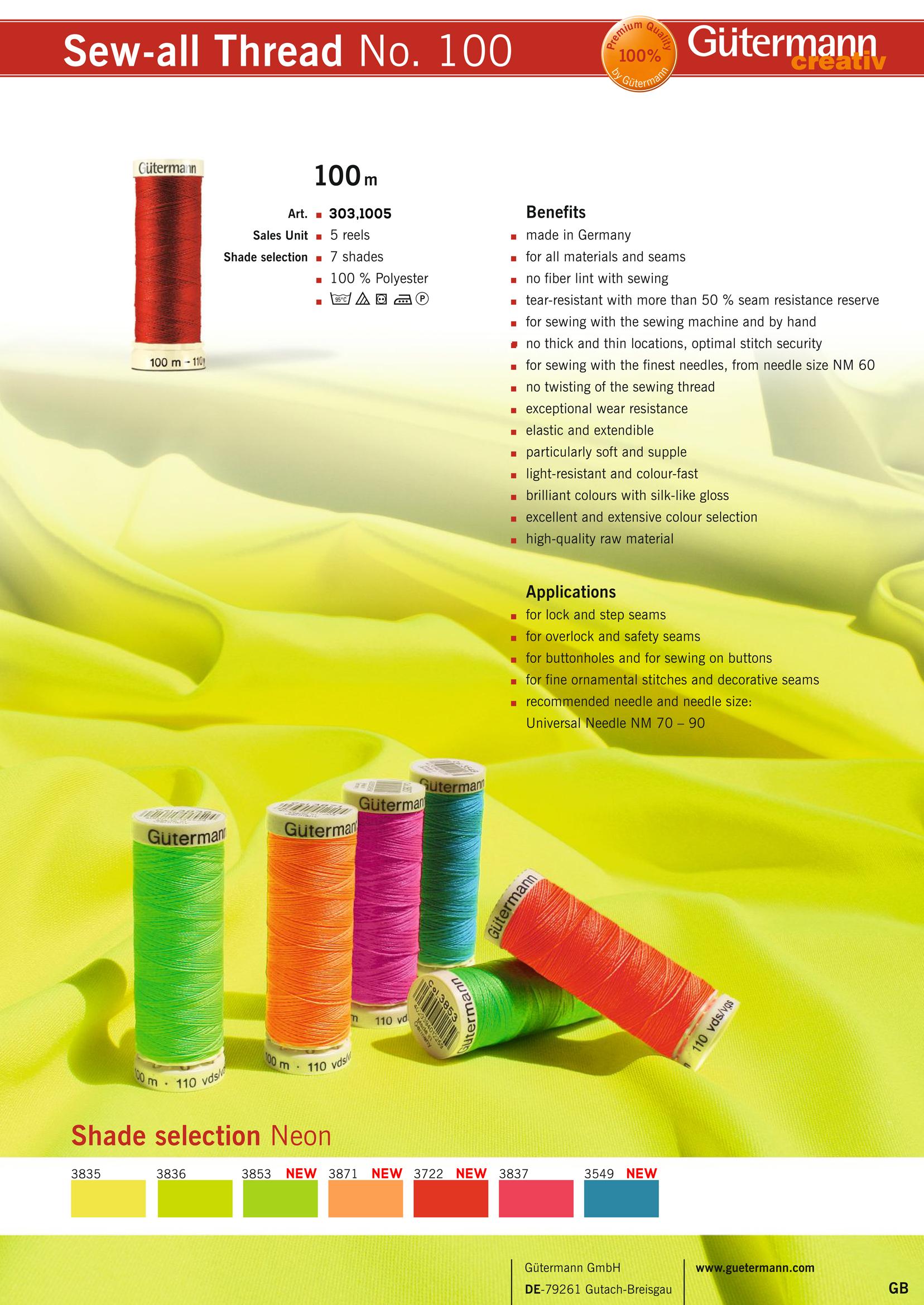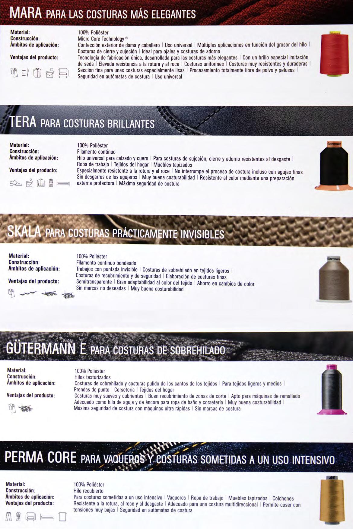 Ventajas del producto Especialmente resistente a la rotura y al roce | No interrumpe el proceso de costura incluso con agujas finas | Sin desgarros de los agujeros | Muy buena costurabilidad | Resistente al calor mediante una preparación externa protectora | Máxima seguridad de costura
