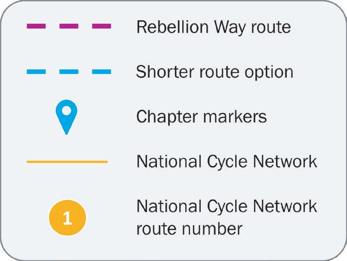8 Rebellion Way route Shorter route option Chapter markers National Cycle Network National Cycle Network route number1 13 13 11 1 1