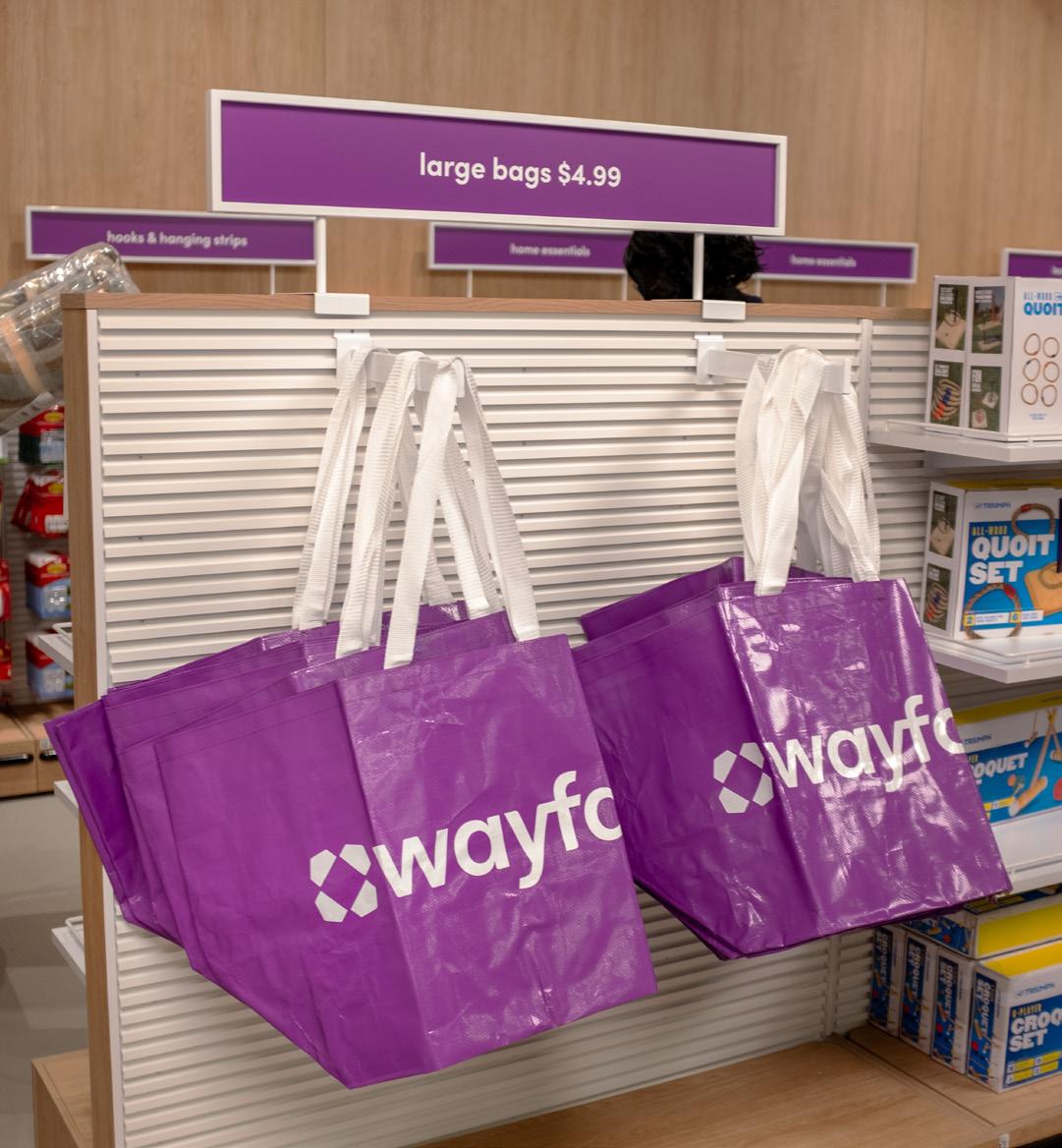 Wayfair’s first brick & mortar store called for a suite of new packaging including a number of resuable and sustainable options. Two RPET bags available for purchase, and sturdy paper bags made from certified FSC paper are available in the store.