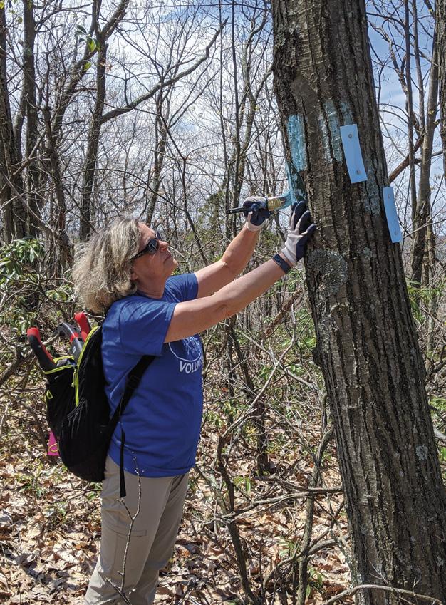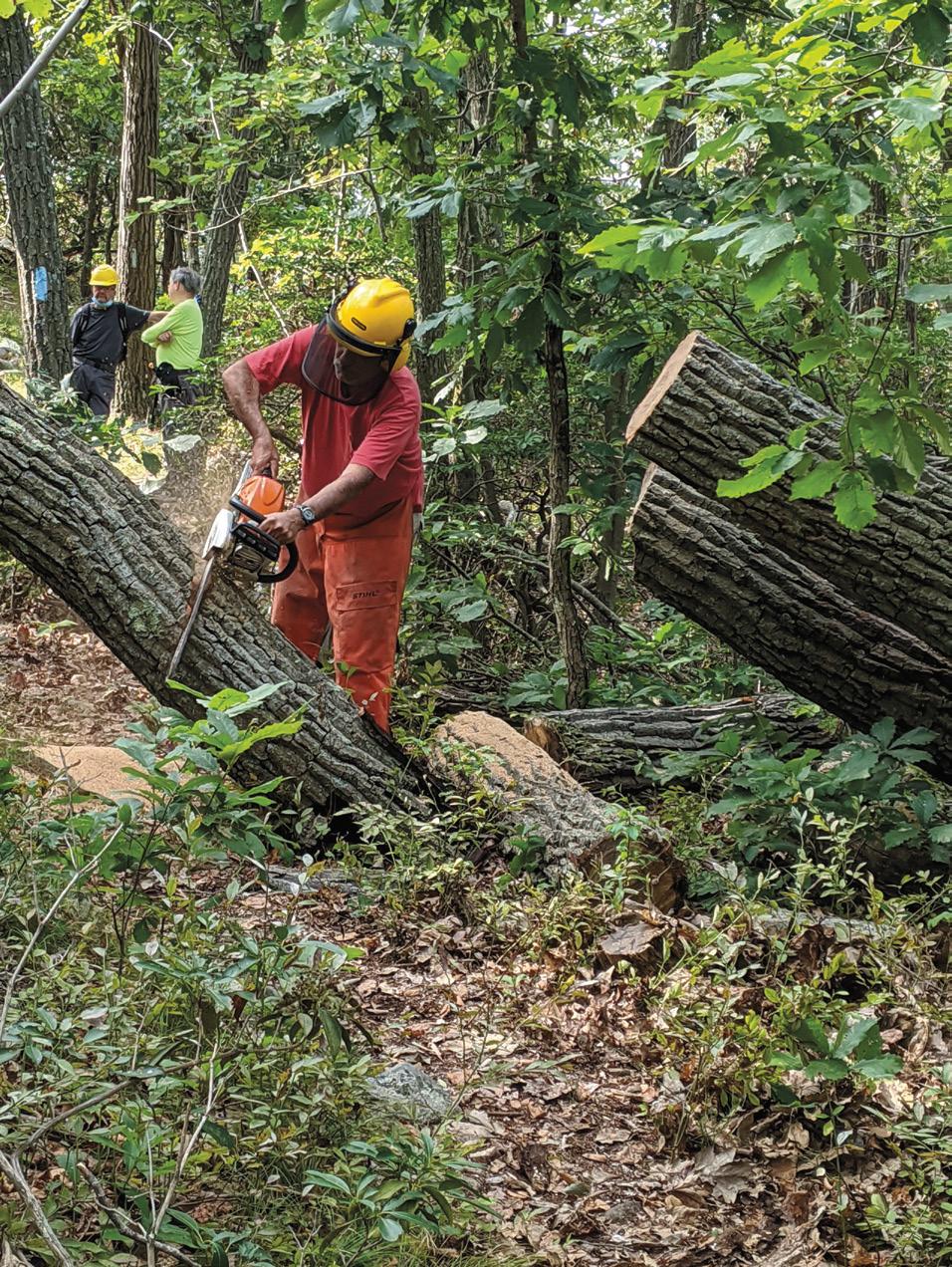 Ayear later, Clare Cain, CFPA’s Trail Director, asked me to manage this trail section. I accepted. The diminished forest cover has changed the character of this woodland in many ways. The open areas have given rise to a succession forest. We now see a true mixed woodland that includes pin cherry, black birch, hickory, white pine, American hornbeam, hop hornbeam, staghorn sumac, tulip poplar, sugar maple, American chestnut saplings, and sassafras. The understory includes pink lady’s slipper, plumed Solomon’s seal, meadow rue, maple leafed viburnum, and high bush blueberry. This proliferation of plant life has also brought its challenges. Instead of using a pruner, we need to use battery-powered string and hedge trimmers to beat back the brambles growing in the open, sunny paths along the trail. Fortunately, the birds and other wildlife have returned to their habitat.