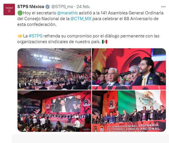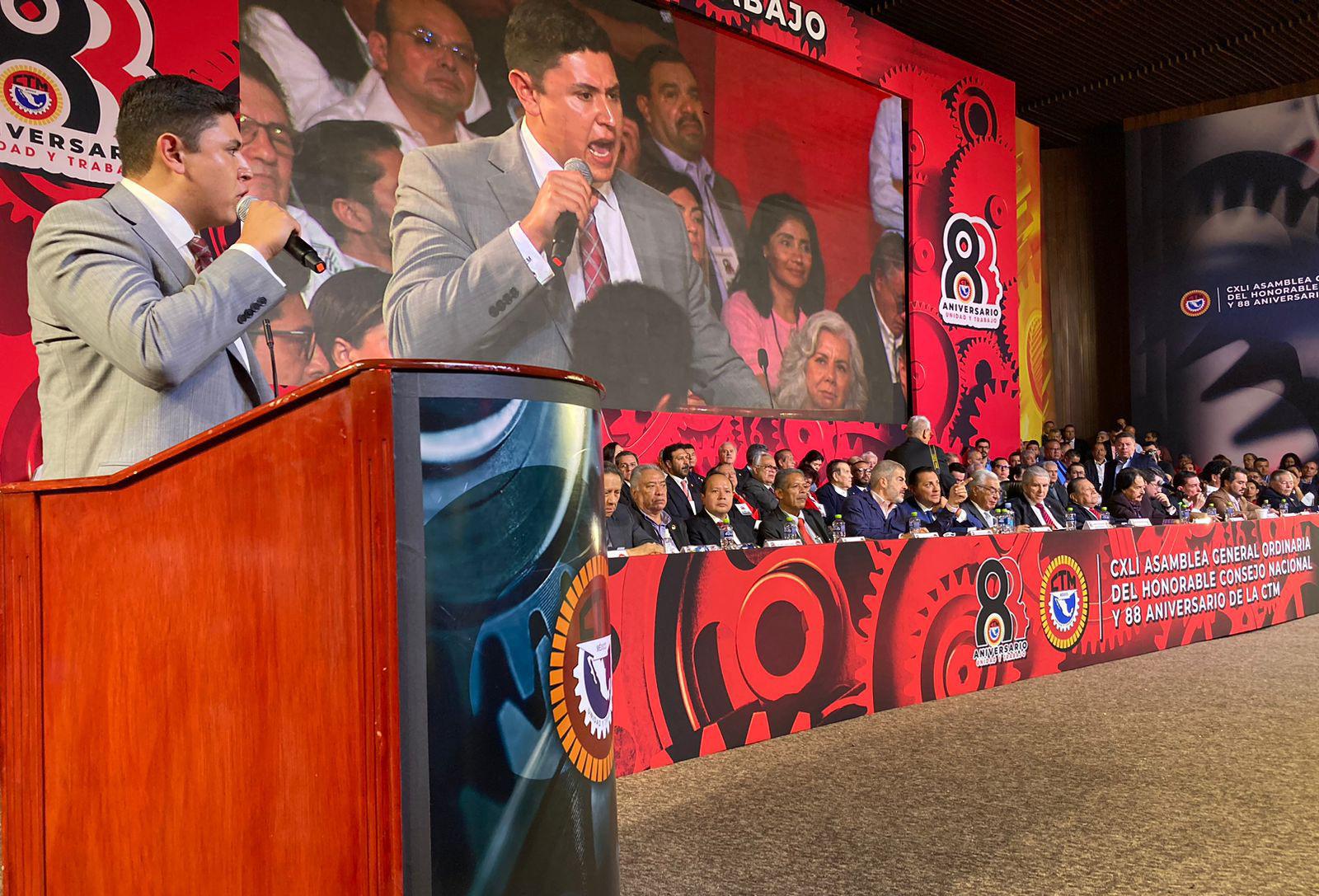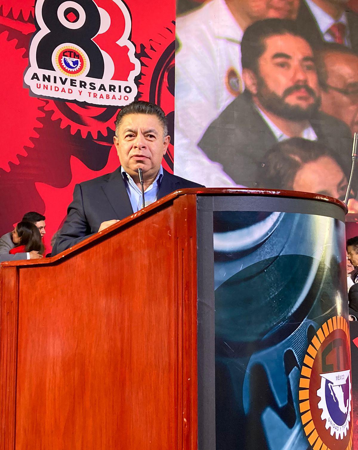 El funcionario aprovechó la tribuna para hacer un recuento de los logros alcanzados para las y los trabajadores, por la presente administración, y reconoció la colaboración y el entendimiento que ha tenido la CTM con el gobierno.