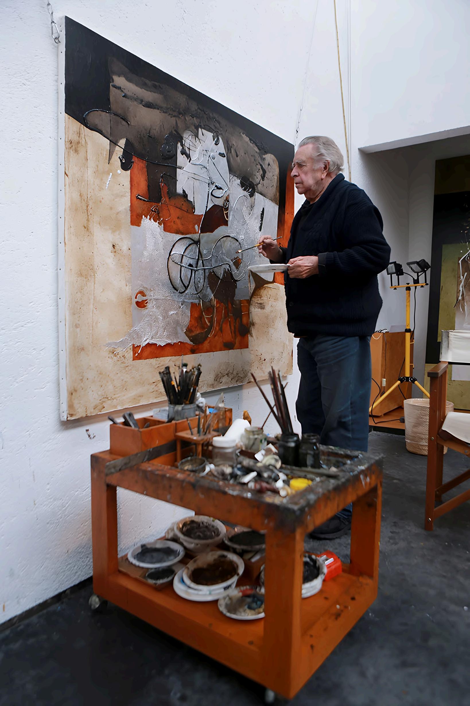 Trabajó extensamente con materiales industriales, chatarra, hierro oxidado, relieves de metal y ensamblajes que incorporaban la textura del desgaste. Ese uso de la materia le permitió construir un lenguaje donde la superficie pictórica se volvía casi escultórica