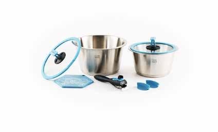 The Foundation set comes with three pots that double as mixing and serving bowls, and a non-stick ceramic coated pan, clever space saving lids, a trivet,