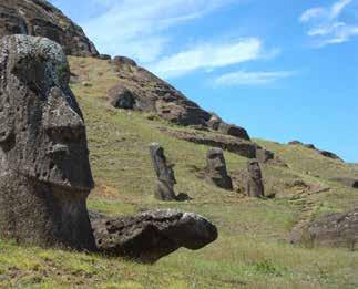 Vi besøger også vulkanen Ranu Raraku, hvor næsten alle stenstatuerne blev udhugget. Her venter stadig flere hundrede statuer på transport til de steder langs kysten, hvor det var planlagt, de skulle stå. Vi går en tur gennem landskabet ad den gamle transportvej, hvor statuerne blev bragt til deres plantforme.