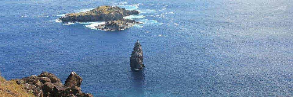 Påskeøen:Udsigten fra kraterranden ved Orongo mod Moto Iti.I en konkurrence skulle deltagerne klatre ned ad den stejle kratervæg,svømme ud til øen, finde et æg,svømme tilbage og klatre op til Orongo og aflevere ægget.