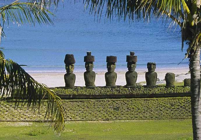 Vi ser ud over statuerne på Anakena standen.Udover statuerne findes også den første,der blev rejst afThor Heydahls hold under hans ophold i 1955. Vi besøger stranden,og her er der mulighed for at bade fra stranden med det fine hvide koralsand.Det var påAnakena stranden at de første bosættere kom i land og det var ud For Anakena stranden atThor Heydahl ekspeditionsskib lå 1 1955-56.Her blev rejst telte og opsat borde og køkkenfaciliteter i den lejr hvorfra ekspeditionerne på Påskeøen udgik.I dag er stranden et populært udflugtsmål for lokal beboere – og turister.