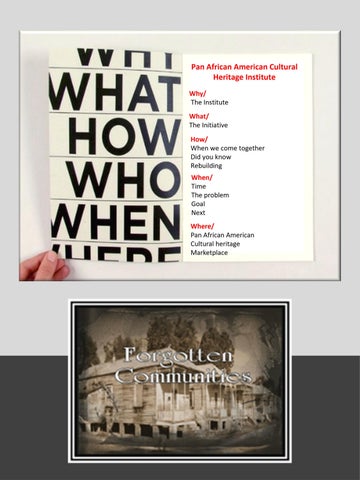 Forgotten Communities is not just Black Heritage, it is a spiritual movement, to showcase a people of dignity and neighborhoods through cultural heritage tourism and the arts; by the creation and clustering of micro enterprise businesses that support the needs of the community.