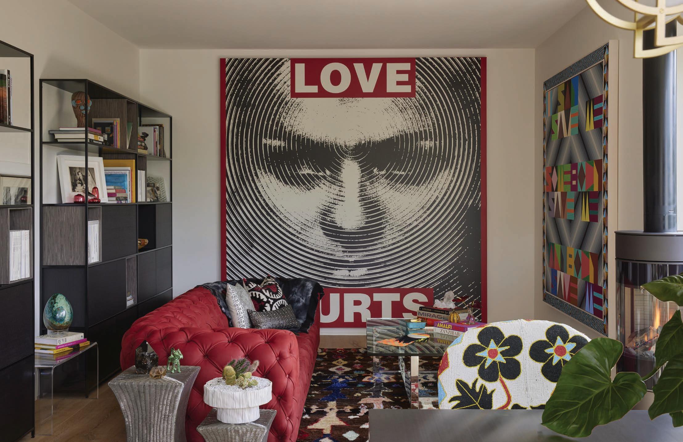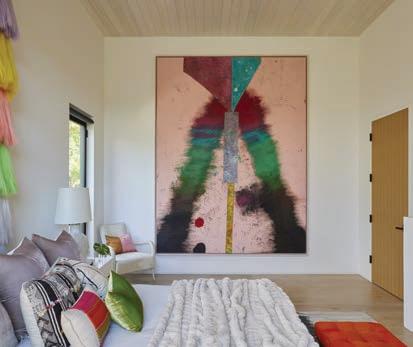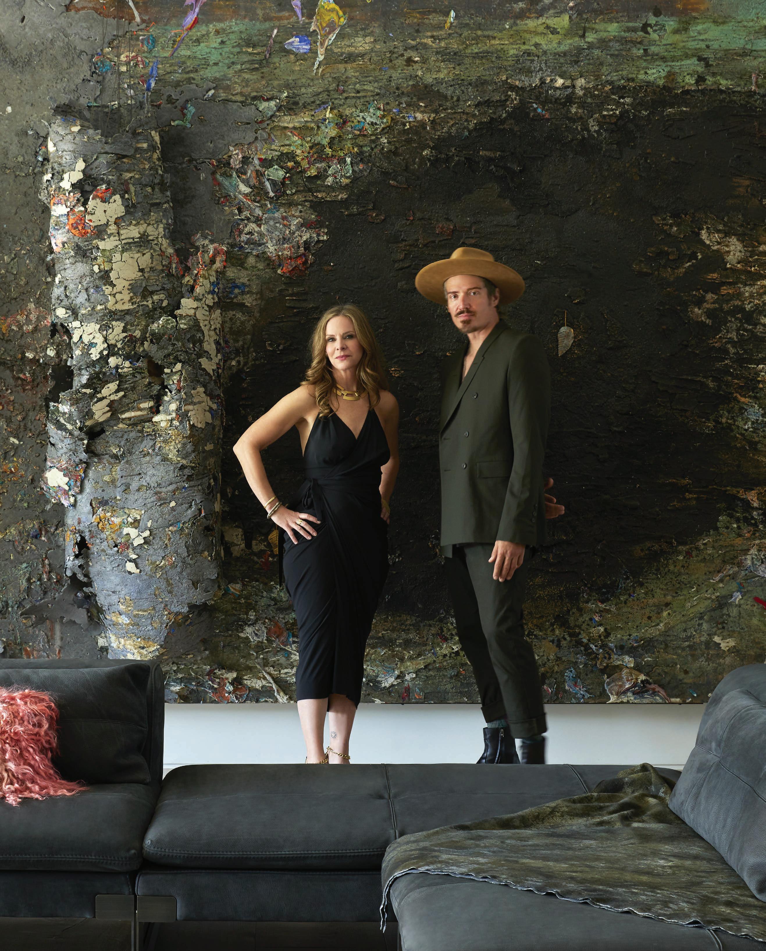 These days, the stories that accompany the works in the couple’s collection fill the house as much as the works themselves: In the entertainment room, a Rashid Johnson mixed-media Untitled Escape Collage, 2019 , blankets an entire wall. Precourt bonded with the artist over their shared experiences with recovery. In an interior courtyard, an otherworldly totemic figure in a little pink dress by Huma Bhabha stands like a sentinel, presiding over Precourt while she reads or practices yoga. “We predicted it would scare the daylight out of my mother—and it did,” Jensdotter recalls. Covering an entire wall of the living room is Anselm Kiefer’s Engel der Geschichte, a monumental mixed-media painting completed and acquired in 2017. It weighs nearly 2,700 pounds and stretches 21 feet. “The whole building was engineered to support [it],” Precourt says. Jensdotter, an artist who counts the German painter among his influences, describes how Kiefer sprayed this densely layered landscape piece with molten lead, causing the surface of the canvas to peel and curl and creating two wing-shaped forms that suggest a phoenix rising from the ashes. “I’ve been through some tough times,” adds Precourt, “and that idea of resurrection and resilience really spoke to me.” By this point, the couple has amassed more than 140 works by artists including Lauren Halsey, Sterling Ruby, Mary Weatherford, Fred Eversley, Barbara Kruger, and El Anatsui. “I look at our collection, and there’s a lot of discussion about otherness, pain, struggle—and also reconciliation, hope. We’re not looking at values and buying based on [the] market,” Precourt concludes. “Every piece, I feel it in my gut.”