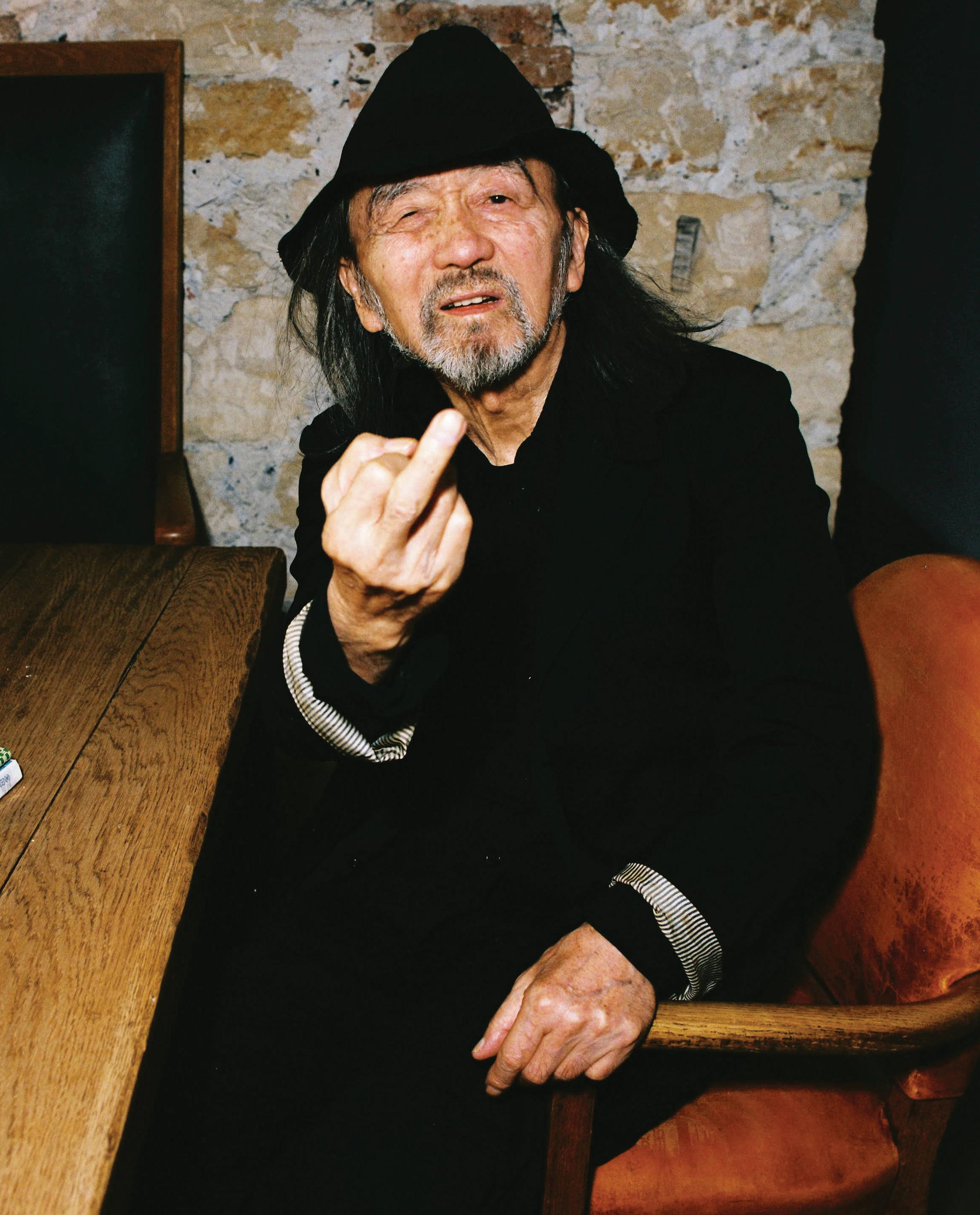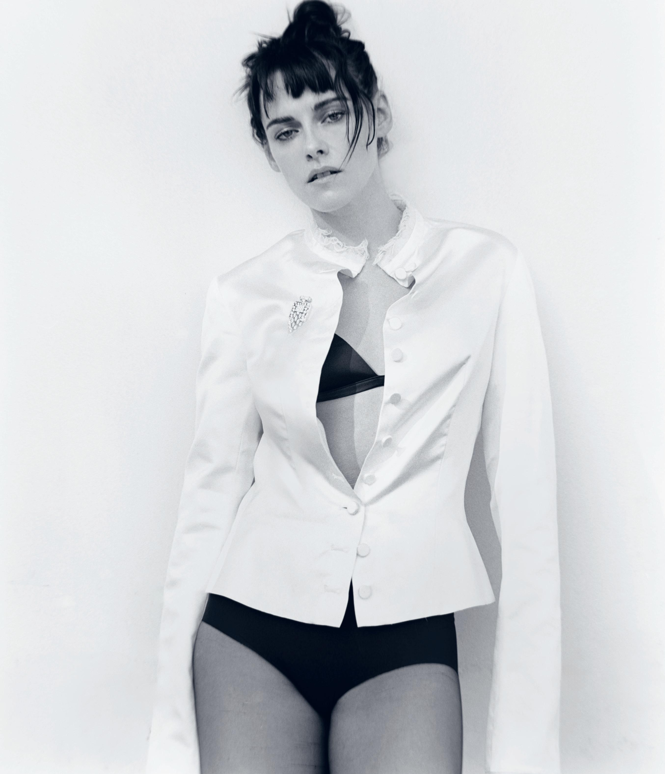 Above: Kristen Stewart photographed by Shane McCauley in Los Angeles wearing a jacket by Colleen Allen, bra by Fleur du Mal, underwear by Commando, tights by Wolford, and brooch by Chanel. Below: Luc Tuymans and Yohji Yamamoto photographed by Léon Prost in Paris.