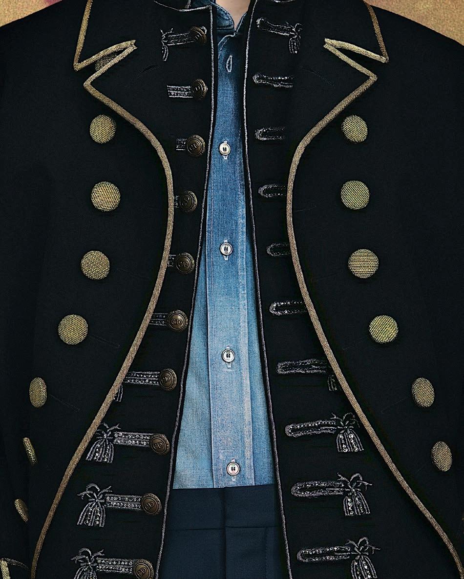 In another nod to historical dress, Anderson envisioned waistcoats and cravats updated with sumptuous details, like metallic embroidery and seed pearls laced into minute floral designs. The raiment synthesizes the designer’s signature clash—elegant yet irreverent.