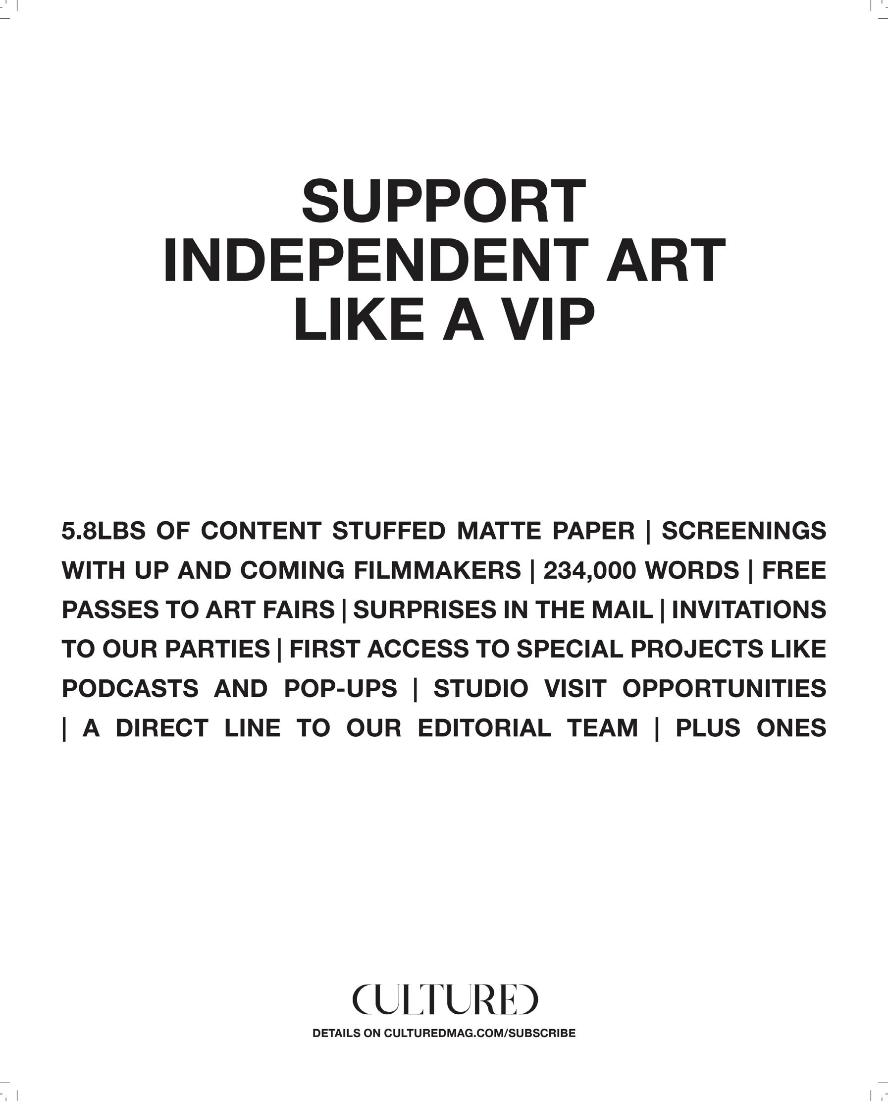 Supporting young artists has been at the heart of our mission since the day I started CULTURED, which makes celebrating the 10th anniversary of our Young Artists list all the more meaningful. To honor the list’s first decade, we gathered more than two dozen of its alums at MoMA PS1 to reflect on how their careers have evolved since we first met them and to speak candidly about how the art world has shaped—and sometimes challenged—their paths. Together, these artists paint a vivid picture of where we might go from here and remind us of the power and necessity of community. This issue also celebrates our second annual MZ Wallace and CULTURED Young Artists Prize, which continues our commitment to giving the artists we platform the freedom to dream and create on their own terms.
