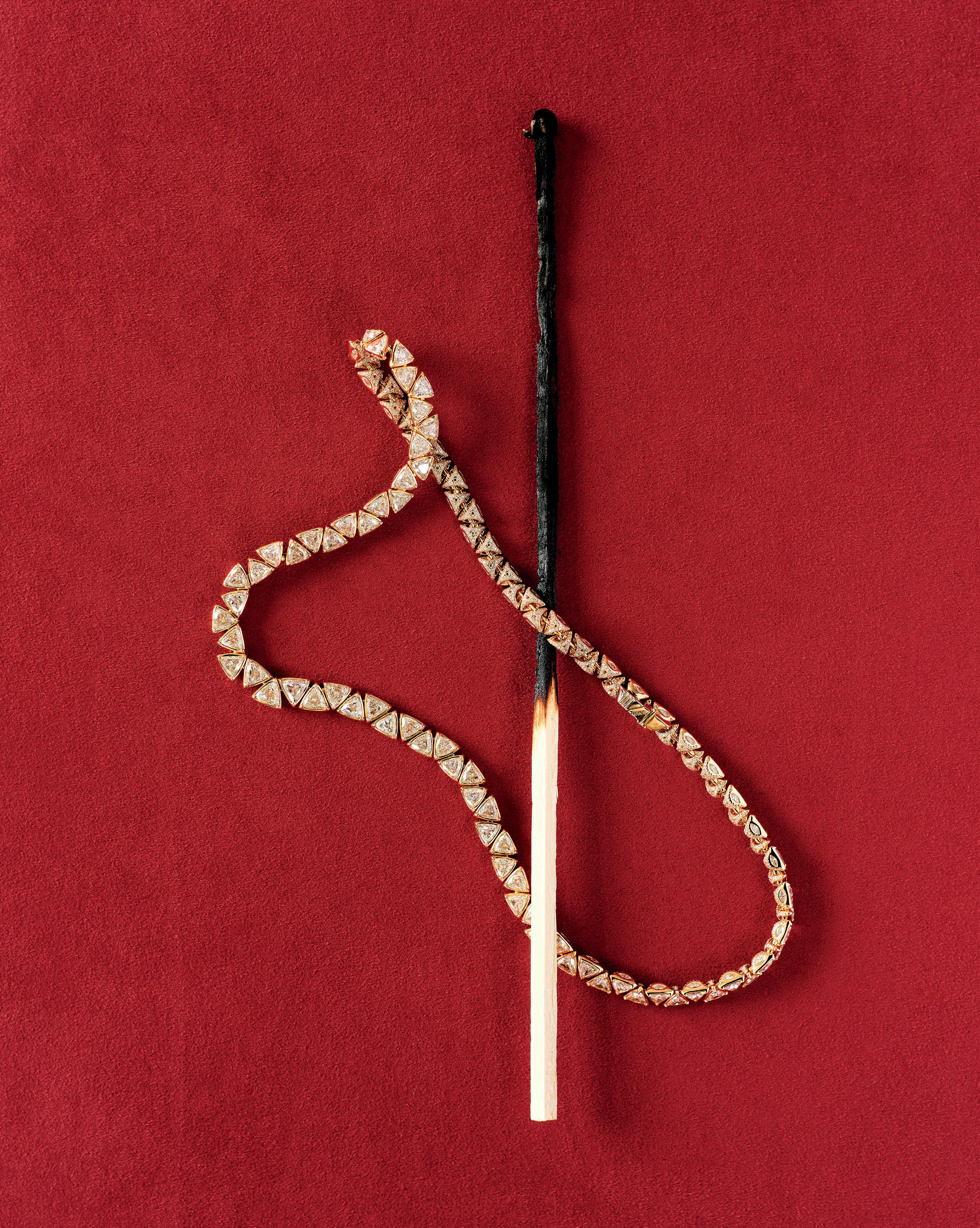 The cool weight of a necklace on skin obscures the blaze of heat that formed its materials. Temperatures climb to 1,948 degrees Fahrenheit before gold transforms into liquid and can be strung into delicate chains, links, and pendants— a feat of transformation that’s nearly impossible to envision. Photographer Sergiy Barchuk conjures this bygone heat with a series of images that reintroduces precious metals and stones to the fire that bore them, a reminder of the warmth we carry draped across our bodies.