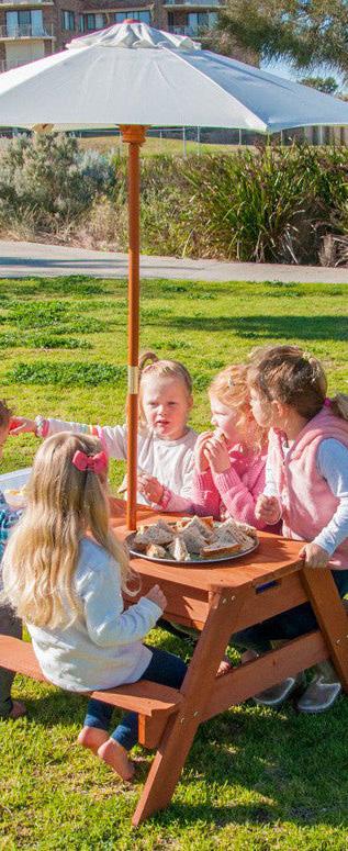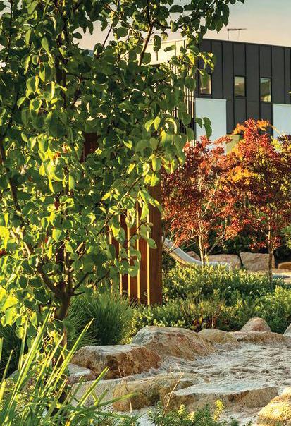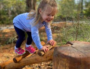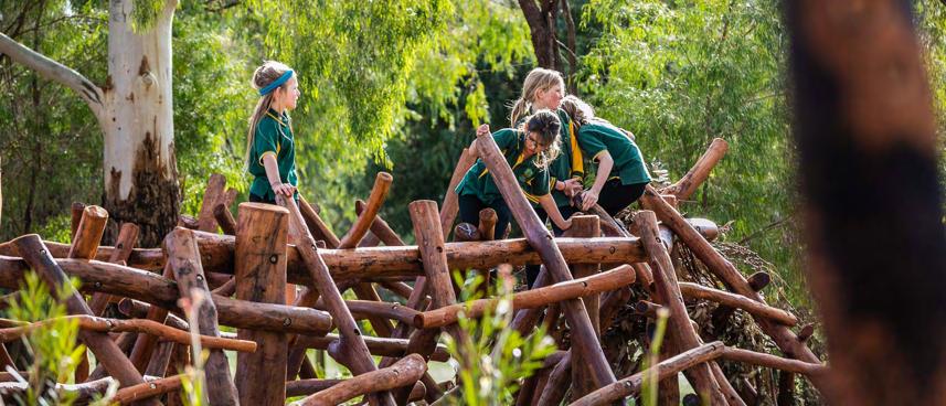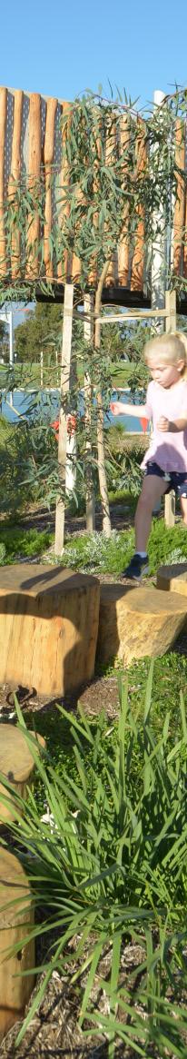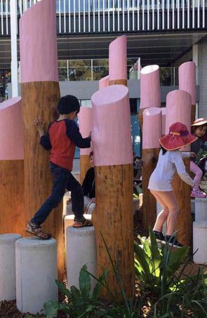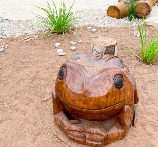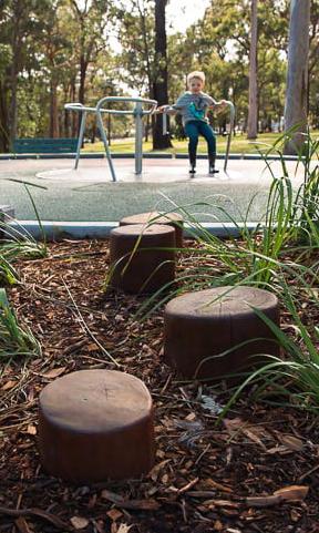 Sensory and musical instruments enhance creativity and inclusiveness. Informal natural play elements such as strategically placed recycled tree logs, sandstone rocks and carved animals offer unique encounters throughout the park.