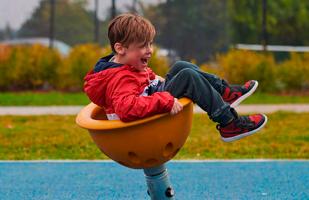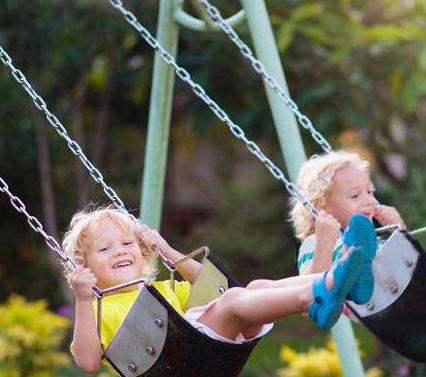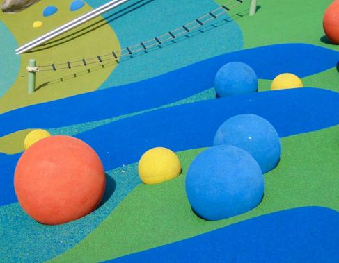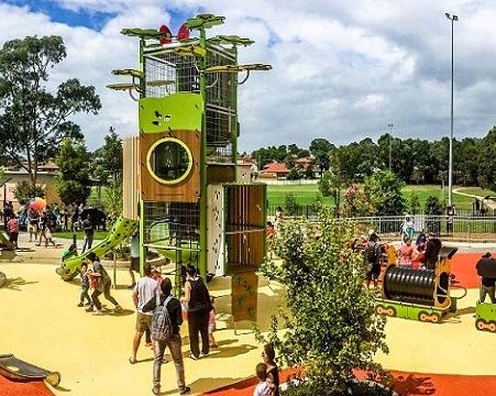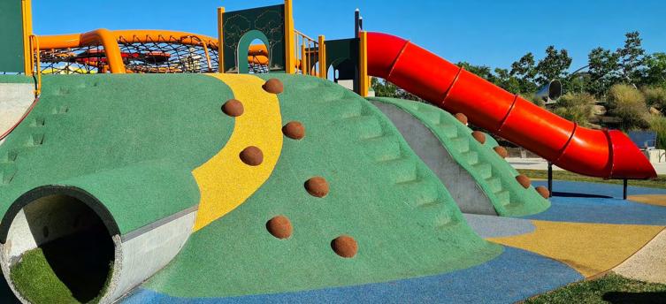 It encompasses traditional play equipment like rockers, slides, swings and trempolines for familiarity.