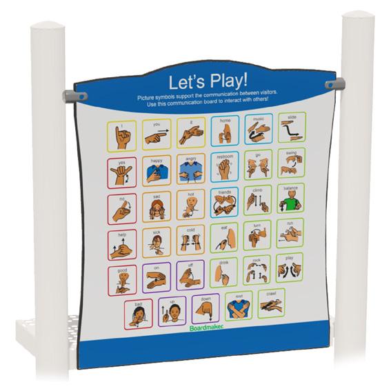 Our double-sided Communication Panels (right) can be installed above or below the deck of a PowerScape play system. One side uses the Boardmaker PCS, the other uses ASL symbols. This make it easy for children and adults to express themselves during play.
