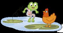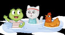 Fran Frog, Fit Fin and Han Hen get wet in the fresh pond.
