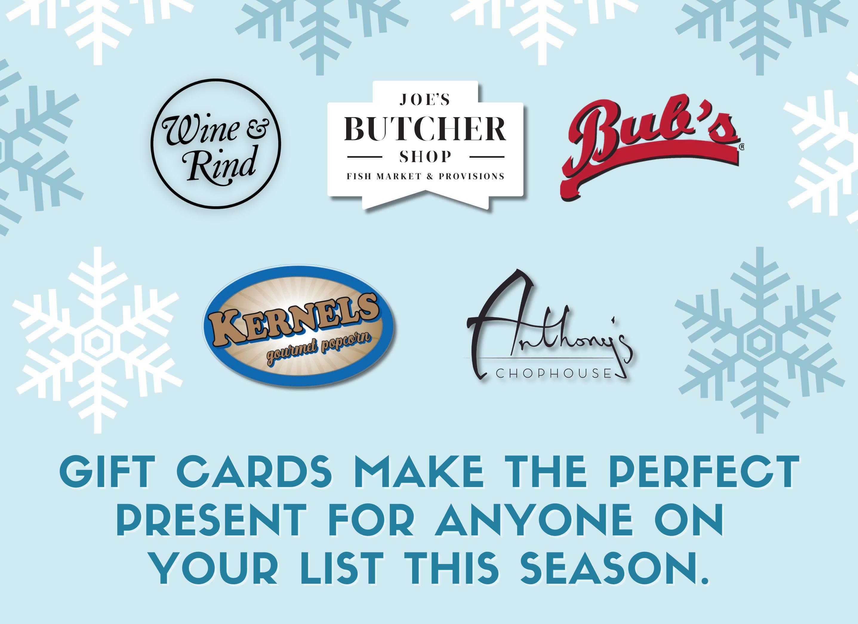 Give the gift of choice this holiday season with a gift card! Many local businesses are offering special deals. Consider a gift card to Indiana State Parks for outdoor adventures or to a local restaurant like Wine & Rind, Joe’s Butcher Shop, Bub’s Burgers, or Anthony’s Chophouse. For a culinary treat, check out Huse Culinary’s gift card offer: a 20 percent bonus on purchases of $125 or more.