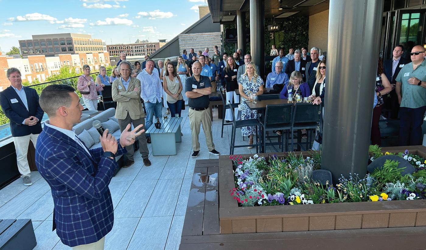 The Heroes Club held a Meet & Mingle event April 30 at 3Up Rooftop Lounge in Carmel. The organization is a nonprofit group of business executives and residents who support Carmel public safety employees. Learn more at theheroesclub.org. (Above) Carmel Police Department Chief Drake Sterling addresses the crowd after being introduced by Mayor Sue Finkam. Sterling became chief in February and previously worked for the Zionsville Police Department. (Right) Heroes Club President Tom Melangton welcomes attendees. (Photos by Ann Marie Shambaugh)