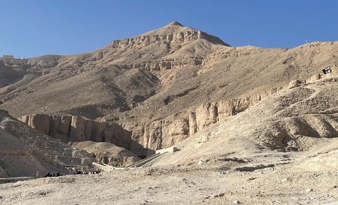 In our continuing tour of Egypt, we visit the Valley of the Kings, containing at least 65 royal tombs, including that of Tutankhamen. By about 1500 B.C., Egyptians had either forgotten how to build pyramids or had concluded that they were too easy to rob. So, they began burying the pharaohs and their families, along with other important Egyptians, in a valley on the west bank of the Nile River near the modern city of Luxor, called Thebes by ancient Egyptians. The site was apparently selected because of the large pyramid-shaped rock overlooking the valley. The area’s soft limestone allowed workers to dig sloping shafts extending hundreds of feet to underground burial chambers enclosing a giant stone sarcophagus. Along all the walls and ceilings, artisans painted scenes of the pharaoh’s life and life with the gods, some intended to give the pharaoh help with questions asked at the final judgment. The pharaoh’s earthly possessions were buried with him (or her) for later use if, as expected, he survived