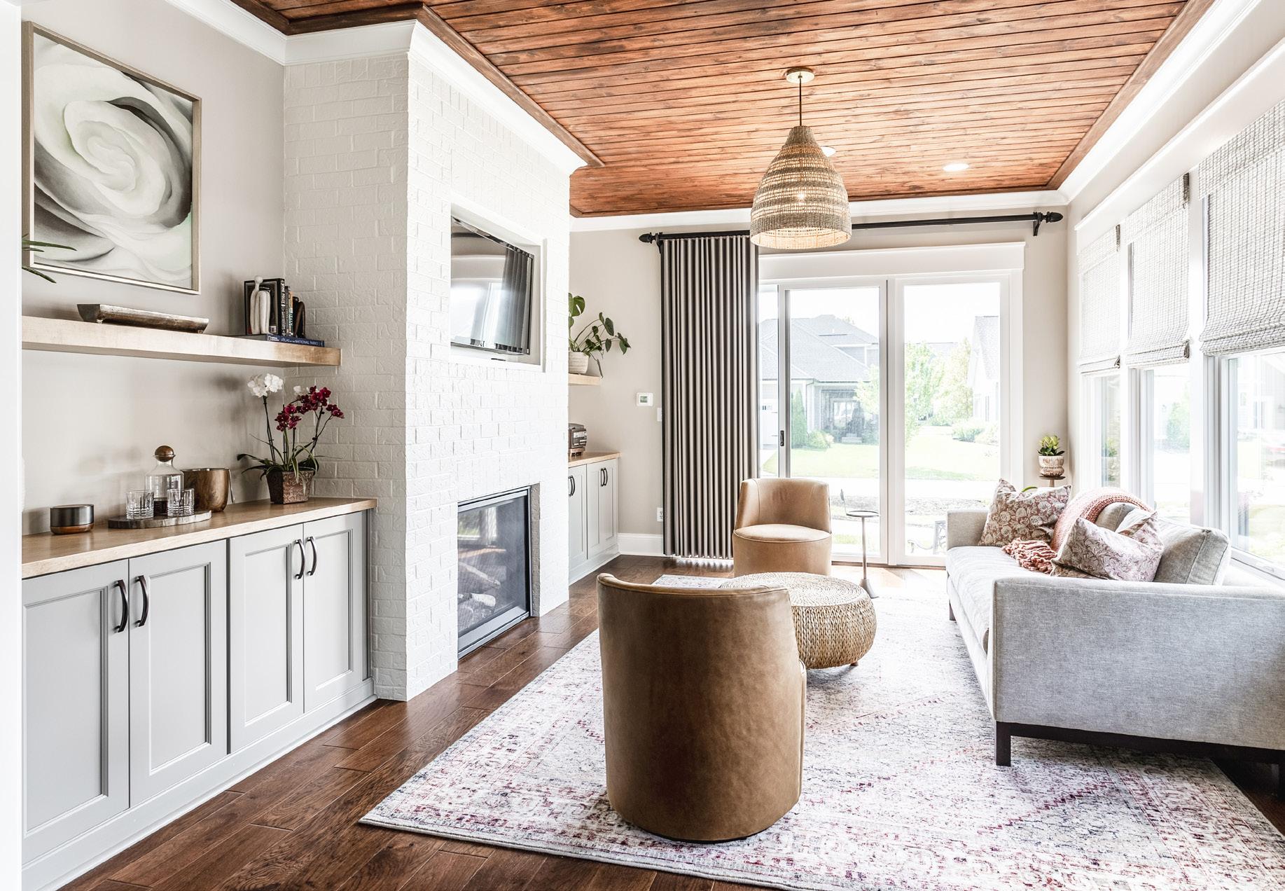 • A wood-planked ceiling adds warmth and a touch of organic appeal.