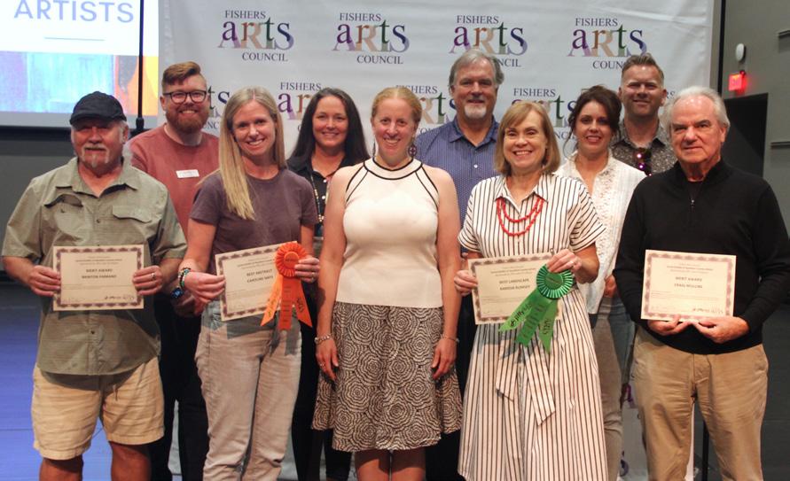 Pictured front from left are Brinton Farrand, Merit Award; Caroline Hays, Best Abstract; Ailithir McGill, executive director of Noblesville Creates; Karissa Rumsey, Best Landscape; and Craig Mullins, Merit Award. Back from left are Ross Hilleary, FAC Board President; Casey Williams, Best Floral/Other; Steve Sanner, Jiffy Lube of Indiana; and Dani and Dan Wasson of Wasson Nursery & Landscape. (Photo courtesy of FAC)