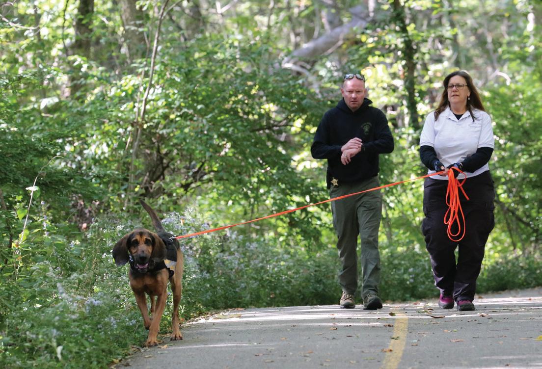 Franki Henriques, right, a volunteer handler with Mas sachusetts-based Search Dogs North east, and her blood hound, Diamond, work with Hamilton County Sheriff’s Office Deputy Nate Biddle to follow the scent of a person hiding in the woods during a Sept. 27 training exercise. (Photo by Ann Marie Shambaugh)