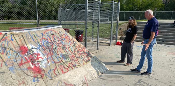 Casper Jones, left, and Lawrence Parks Director Eric Martin inspect graffiti at the Lawrence Skatepark. Jones is cleaning the park up and new artwork will be painted Sept. 8. (Photo by Leila Kheiry)