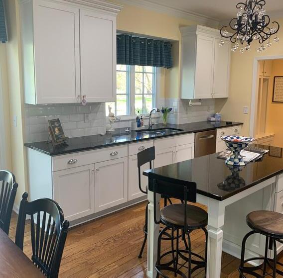 • White cabinetry, a matching backsplash and quartz counters keep the space bright and airy, complemented by the warmth of hardwood floors and a soft, pale blue on the island.