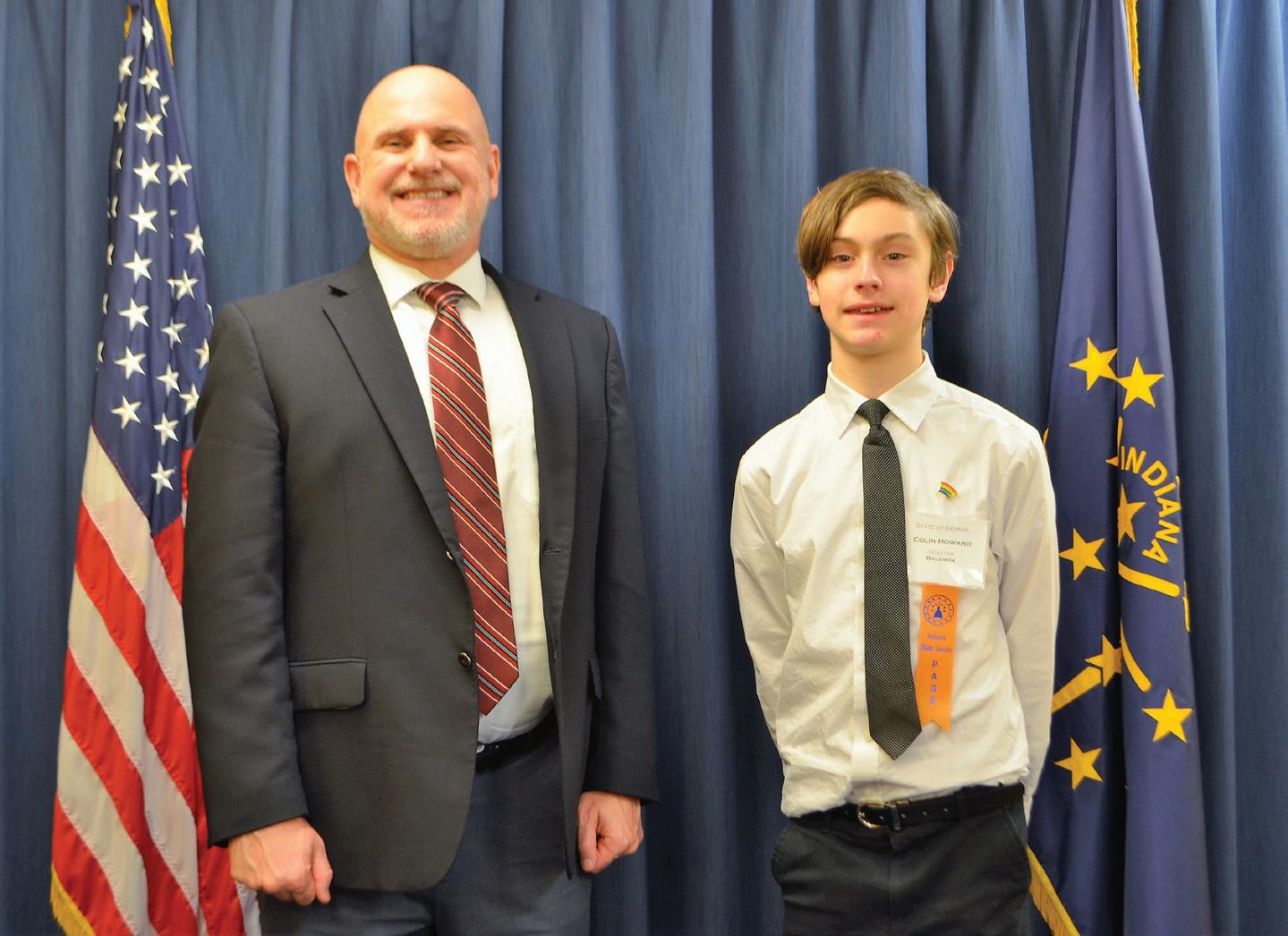 Noblesville West Middle School student Colin Howard, with State Sen. Scott Baldwin, R-Noblesville, recently visited the Indiana Statehouse as a Senate page. Pages in grades six to 12 spend a day at the Statehouse touring the historic building, observing debates from the Senate floor and interacting with their state senator. (Photo courtesy of office of State Sen. Scott Baldwin)