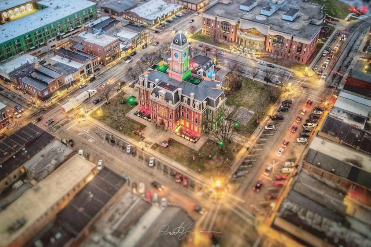 An aerial view of the Old Court house in downtown Noblesville, which has been lit green as part of an initiative known as Opera tion Green Light that is meant to show support for veterans and raise awareness of the challenges they face. (Photo courtesy of Hamil ton County)