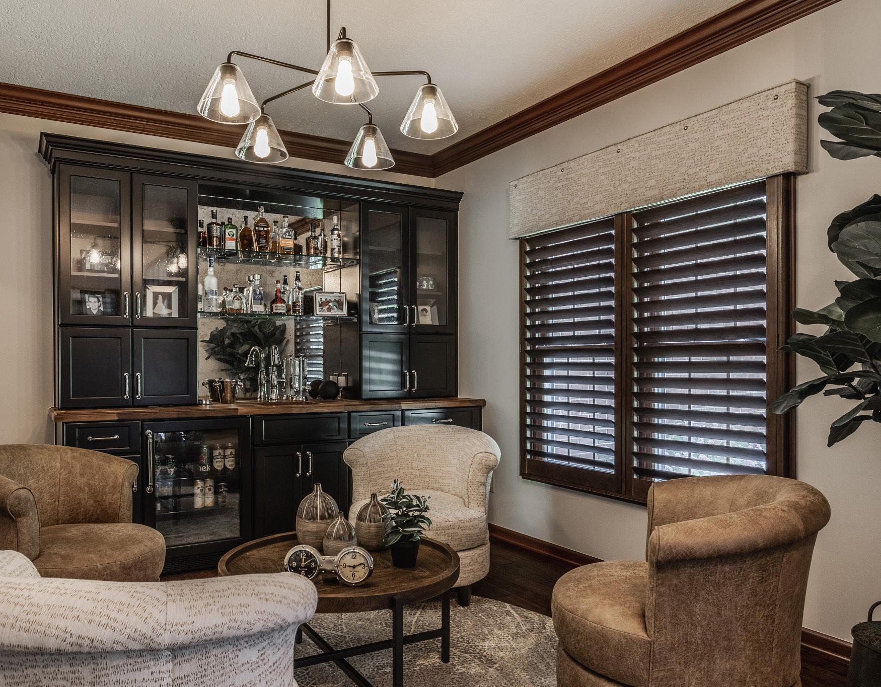 • Wood tones on the counter, molding, and plantation shutters lend organic appeal and depth, balanced by neutral tones on the walls and upholstery.