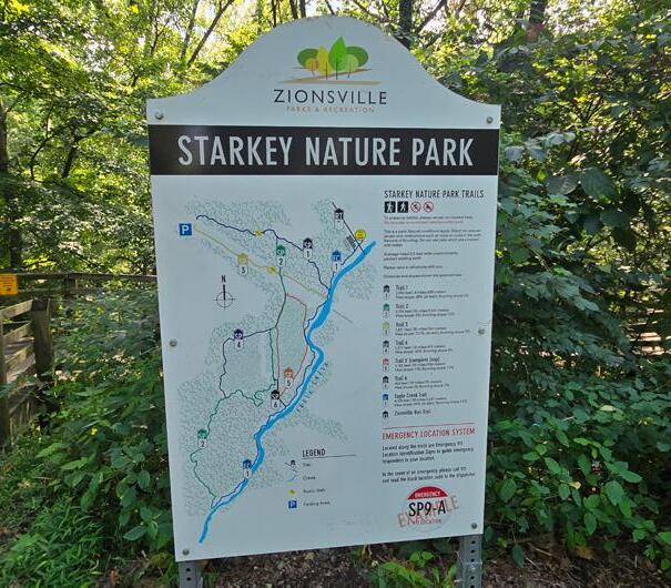 Starkey Nature Park is open year-round from dawn until dusk. Parking is available at the trailhead on Sugarbrush Drive. Hikers can also park at Town Hall and travel 1 mile south on the rail trail to the access ramp; at the Zionsville Road trailhead and travel 1 mile north on the rail trail to the ramp; or at Overly-Worman Park to connect to the Big-4 Rail Trail opposite of Starkey Nature Park.