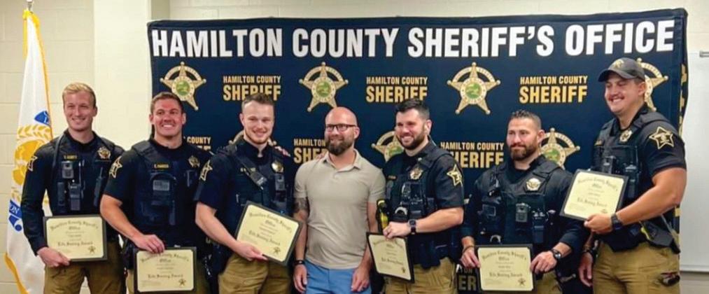Six deputies from the Hamilton County Sheriff’s Office were recently recognized for providing life-saving care to their supervisor, Lt. Brian Niec, who experienced a medical emergency last month. Pictured, from left, is Tyler Abbitt, Eddie Hansen, Daniel Wallace, Niec, Ryan McClain, Skyler Moe and Jared Wilcox. (Photo provided by Hamilton County Sheriff’s Office)