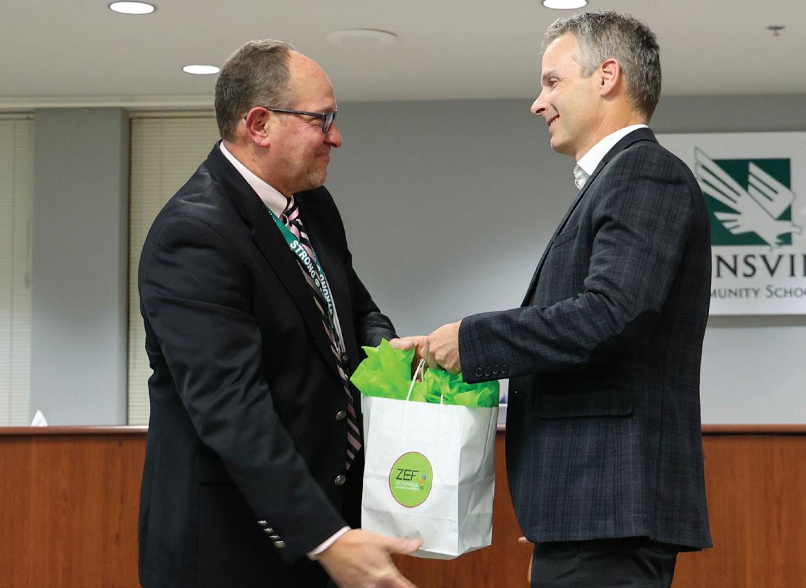 Zionsville Community Schools Supt. Scott Robison accepts a retirement gift from Zionsville Education Foundation Board President Mark Pascarella. (Photo courtesy of Zionsville Community Schools)