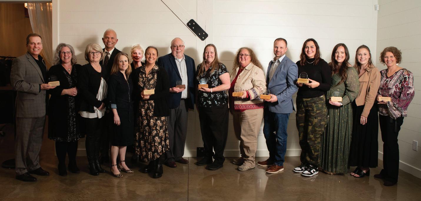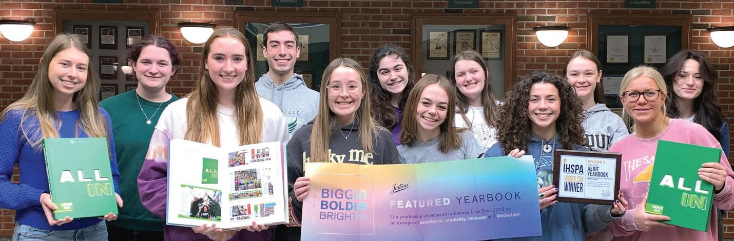 The Zionsville Community High School 2022 “All In” Aerie yearbook earned the Hoosier Star Award from the Indiana High School Press Association, the top student media honor in the state. In addition, the “All In” yearbook was selected from more than 1,000 yearbooks to be featured in a national best of yearbook anthology called the “Jostens Look Book.” The 2022 Aerie was one of only 20 books to receive a double-page spread in the “Look Book,” which is sent to thousands of schools in the U.S. and Canada. From left, yearbook staff members Claire Weesies, Bella Rolsen, Sadie Meenan, Ryan Luke, Abbie Stoops, Rosemary Papa, Grace Howe, Mikayla Query, Madilynn Taylor, Annie Davidson, Greta Bash, Charlee Norton and Maddie Patrick (not pictured). (Photo courtesy of Zionsville Community Schools)