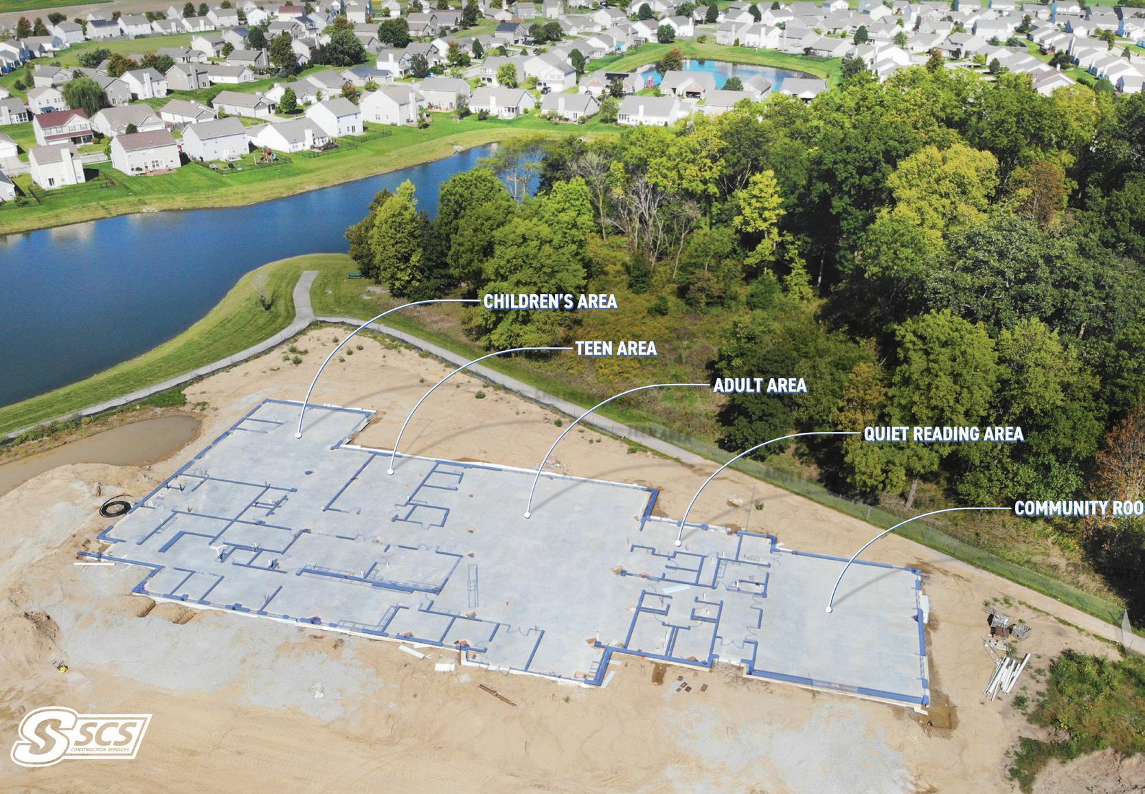 A drone shot shows the foundations for the new branch as of Sept. 21, overlaid with a graphic of the floor plan. (Pho to courtesy of Hussey-Mayfield Memorial Public Library)