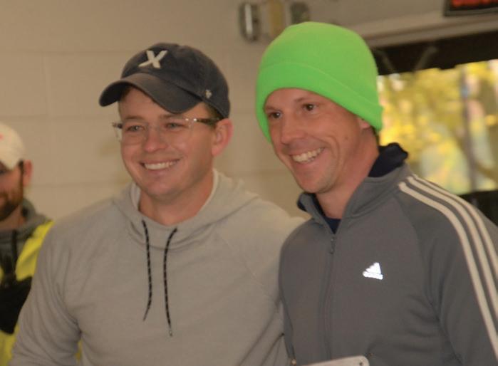 From left, Brandon Bischof of the diabetes committee congratulates Christopher Henry of Carmel on his overall win in the 5K race. (Photo by Edward Redd)