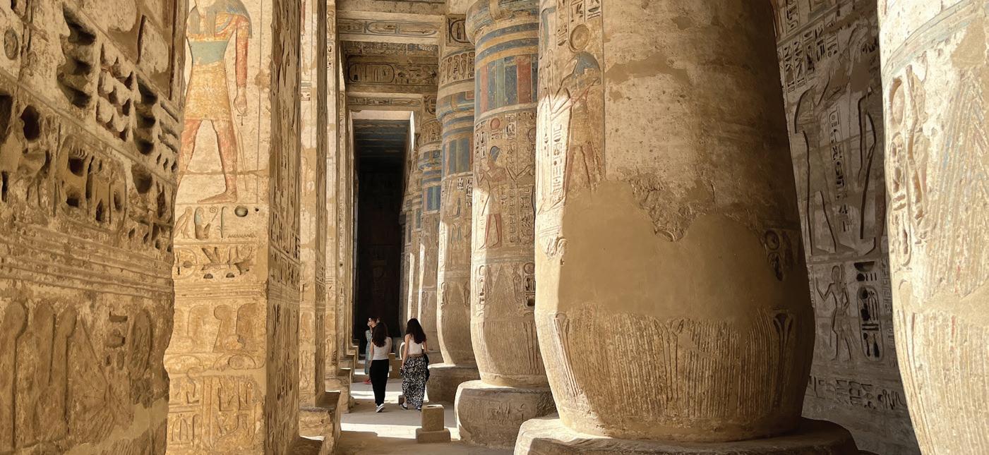 In our continuing tour of Egypt, we visit Medinet Habu, on the west bank of the Nile River across from Luxor. Medinet Habu is the name for the mortuary temple of Pharaoh Ramses III, who ruled Egypt from 1186 B.C. until his death in 1155 B.C. The well-preserved temple celebrated the pharaoh’s earthly achievements and allowed priests to nourish his soul so he could live forever as a god. Columns in the hypostyle hall of his 150-meter-long temple show Ramses among the gods. Statues in a courtyard portray him as Osiris, god of the afterlife. Carvings on the north exterior wall portray Ramses and his troops battling a confederation of invading “sea people,” predominantly people the Egyptians called Pelesets and the Bible calls Philistines. The carvings show the invaders riding three-man chariots pulled by two horses, wielding double-edged swords and long spears, carrying round shields and wearing